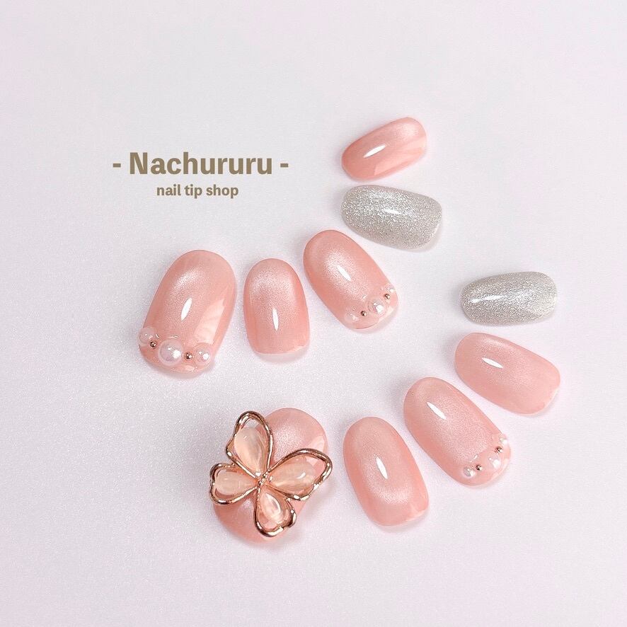 うるっと上品なツヤ感が魅力のヌーディーピンクのうるマグにパールの輝きをプラスした大人可愛いネイルチップです。