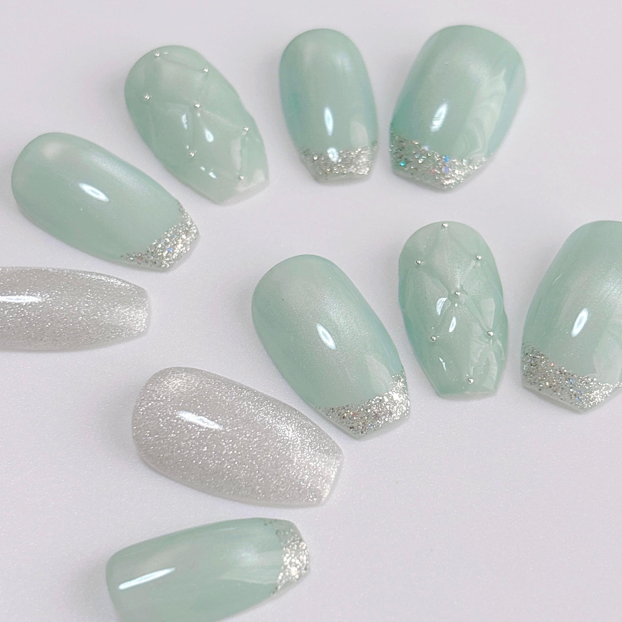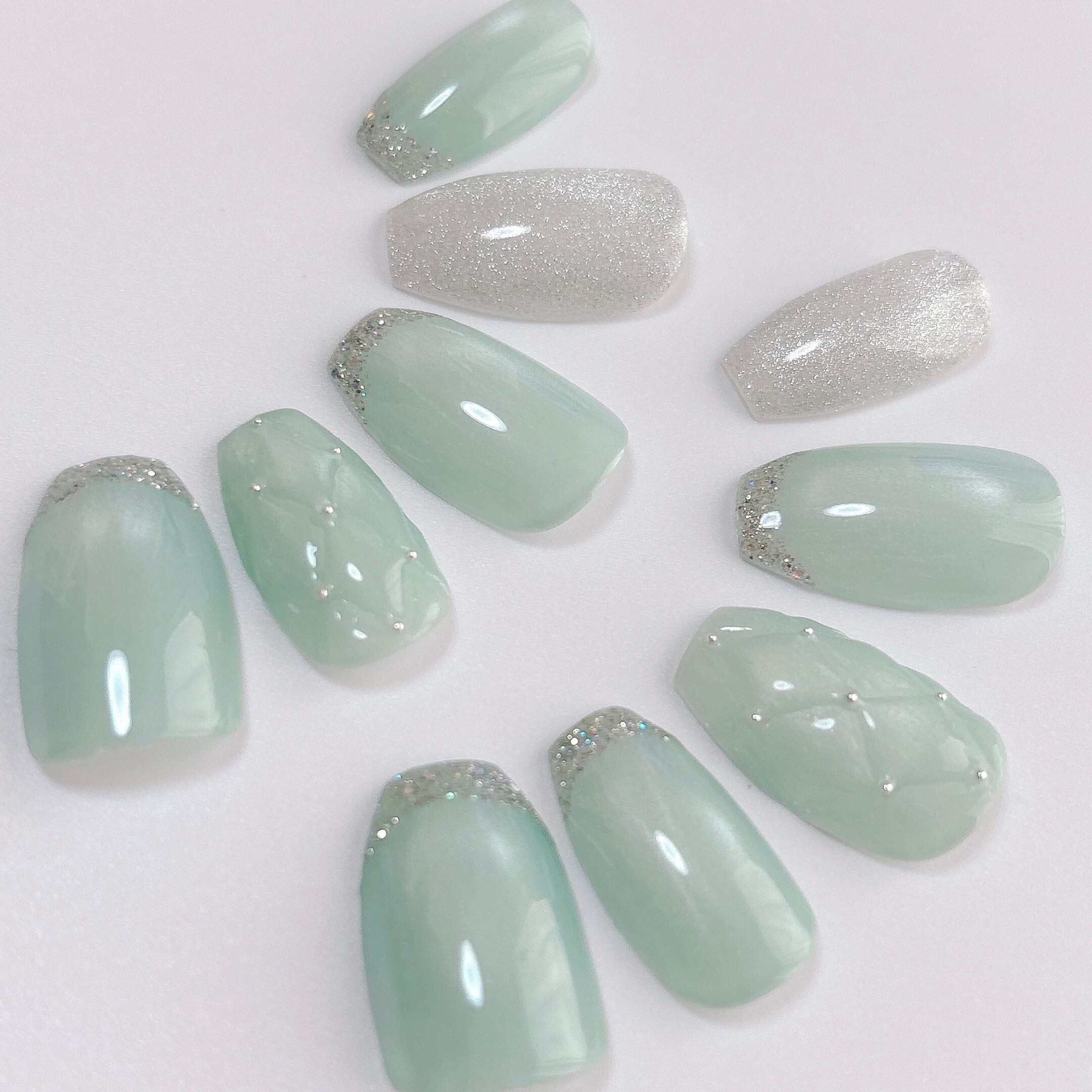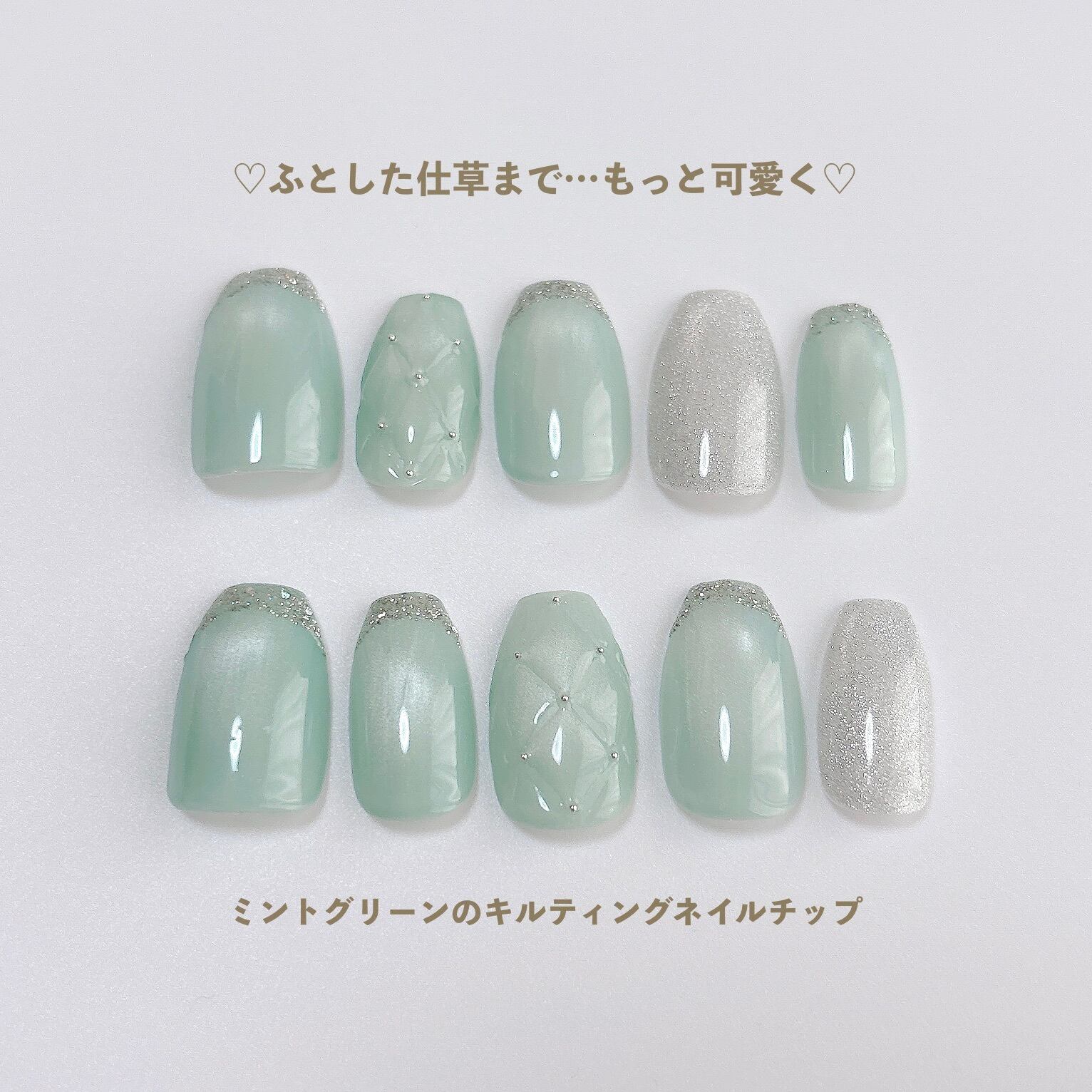 きらめきと透明感ある爽やかミントグリーンのネイルチップです。ガラスフレンチと立体感のあるキルティングアートを添えて、可愛さと洗練感のバランスが絶妙なデザインに仕上げました。