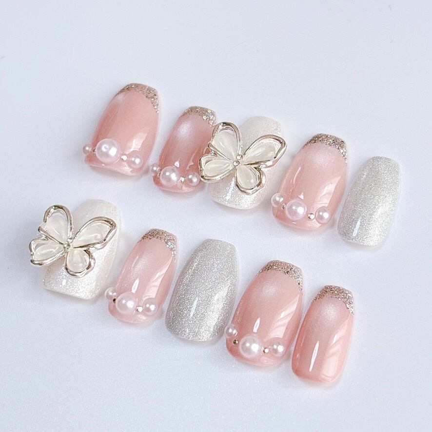 普段より特別なおしゃれをしたい日に最適です。指先のバタフライパーツが気分を盛り上げてくれます。