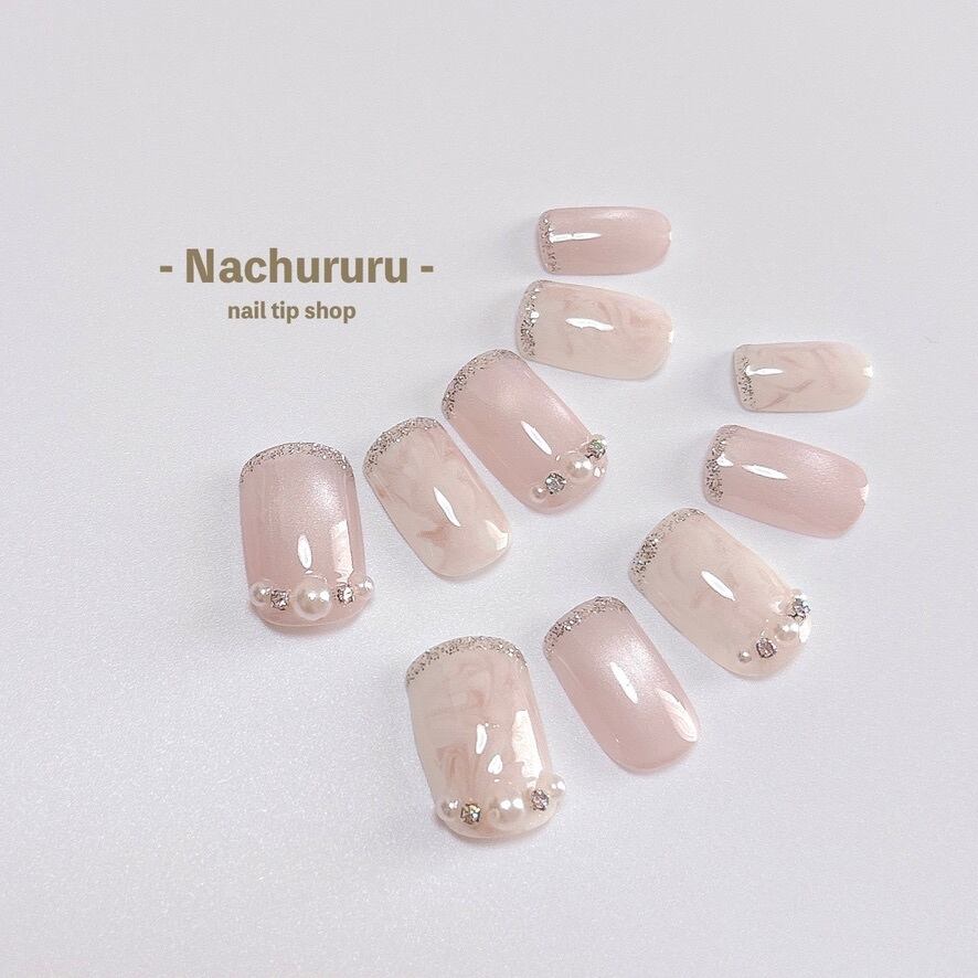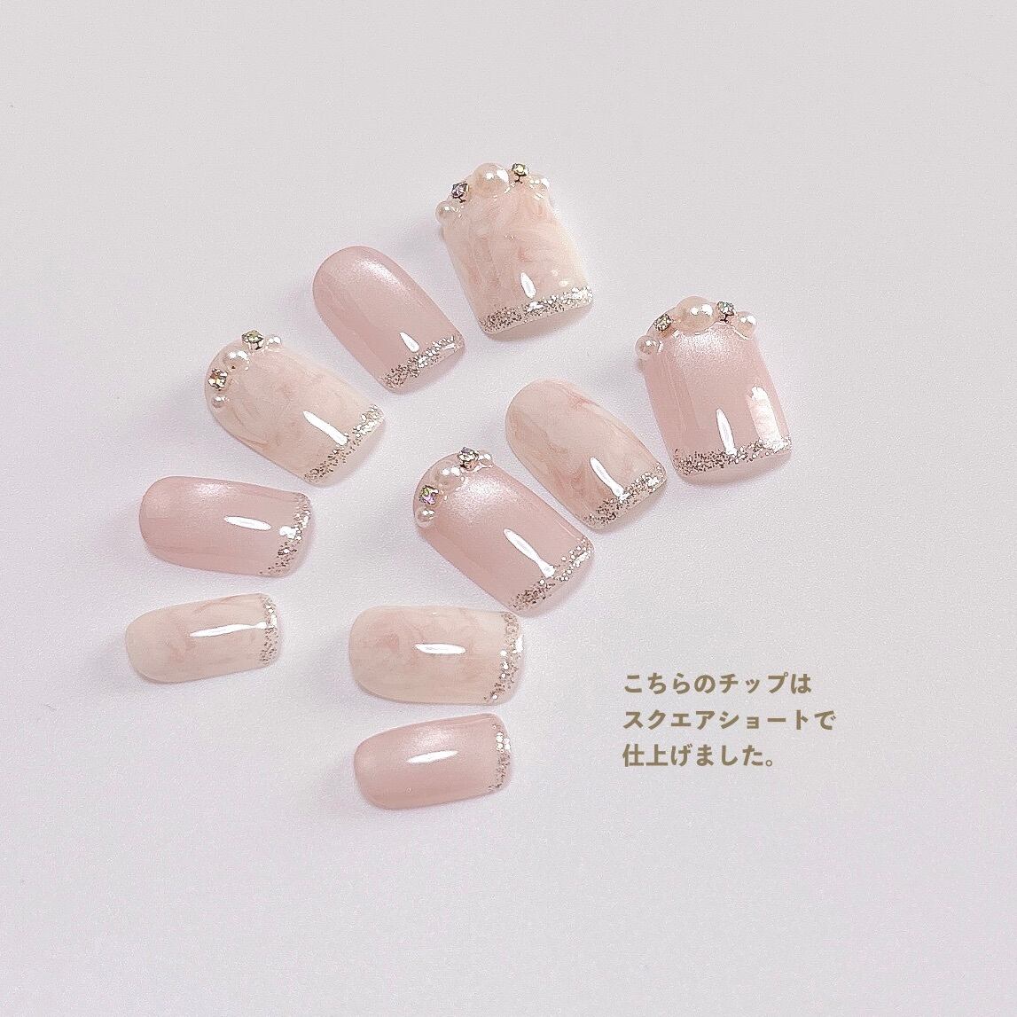 淡いピンクのマグネットネイルが角度によって表情を変える魅力的なネイルチップです。トレンドのうるマグ仕上げと、クリア感たっぷりのガラスフレンチで指先に透明感をプラスしました。