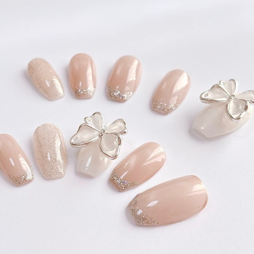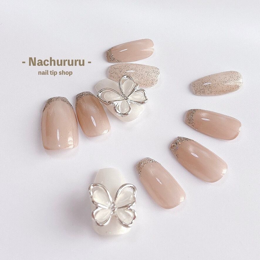肌馴染み抜群のヌーディーベージュのマグネットネイルに、繊細な輝きを放つガラスフレンチで仕上げた上品で洗練されたネイルチップです。