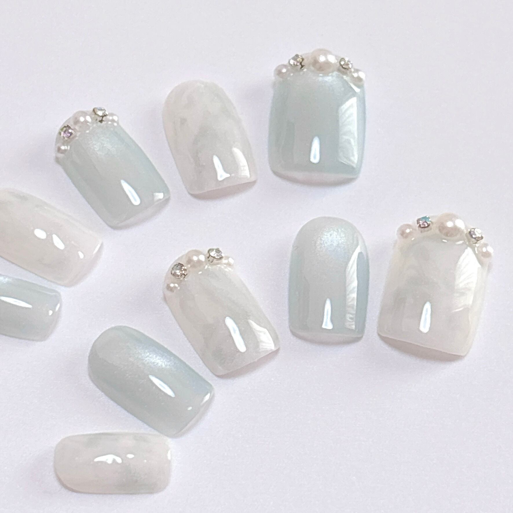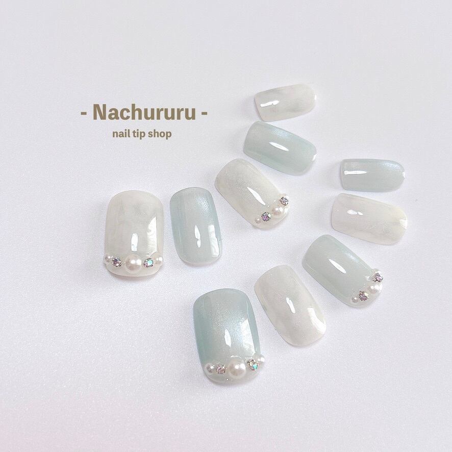 うるうる水色のマグネットネイルとホワイトの組み合わせが美しいニュアンスネイルチップです。さりげないパールとビジューが上品な輝きをプラスして指先を華やかに演出してくれます。