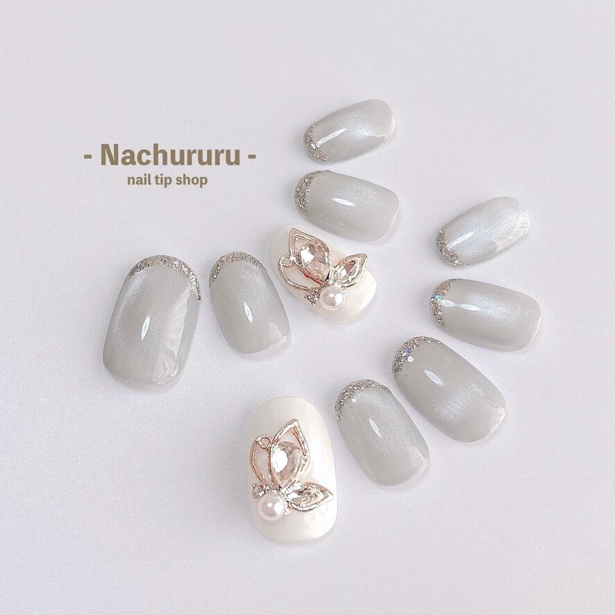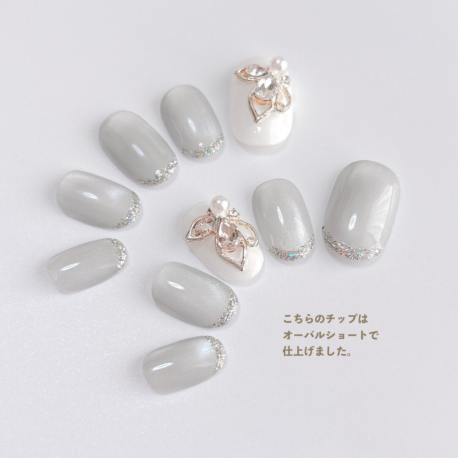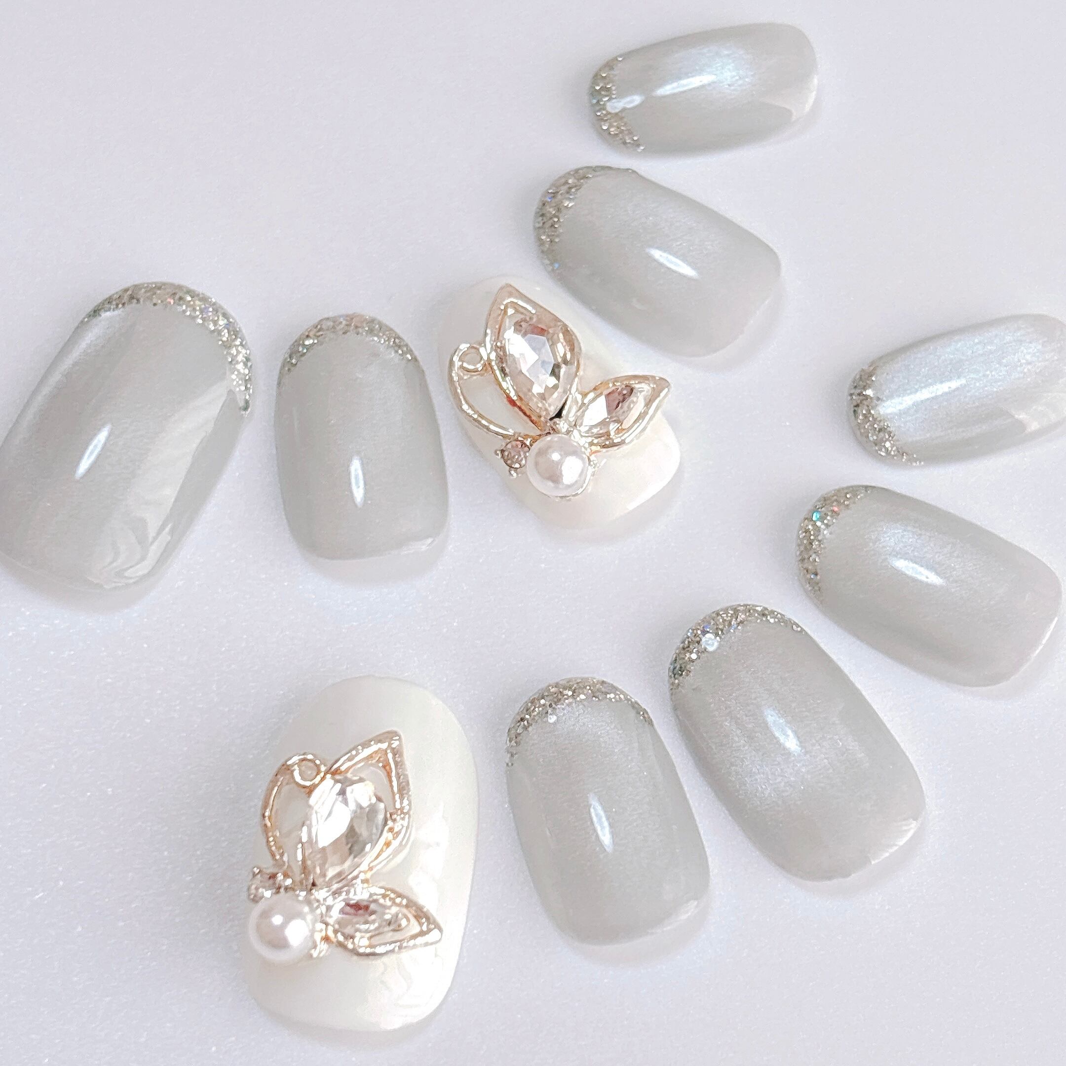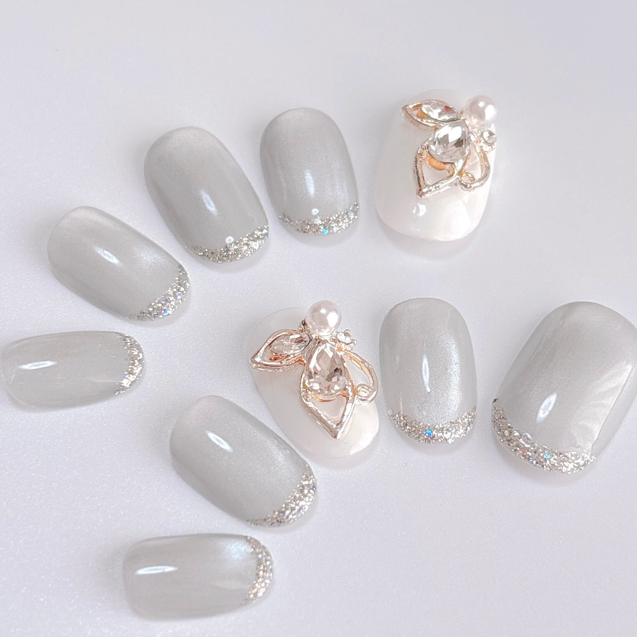 【光を閉じ込めたジュエリーネイル】グレイ マグネット ガラスフレンチ 韓国/パーティ 結婚式 ブライダル 冬 和装