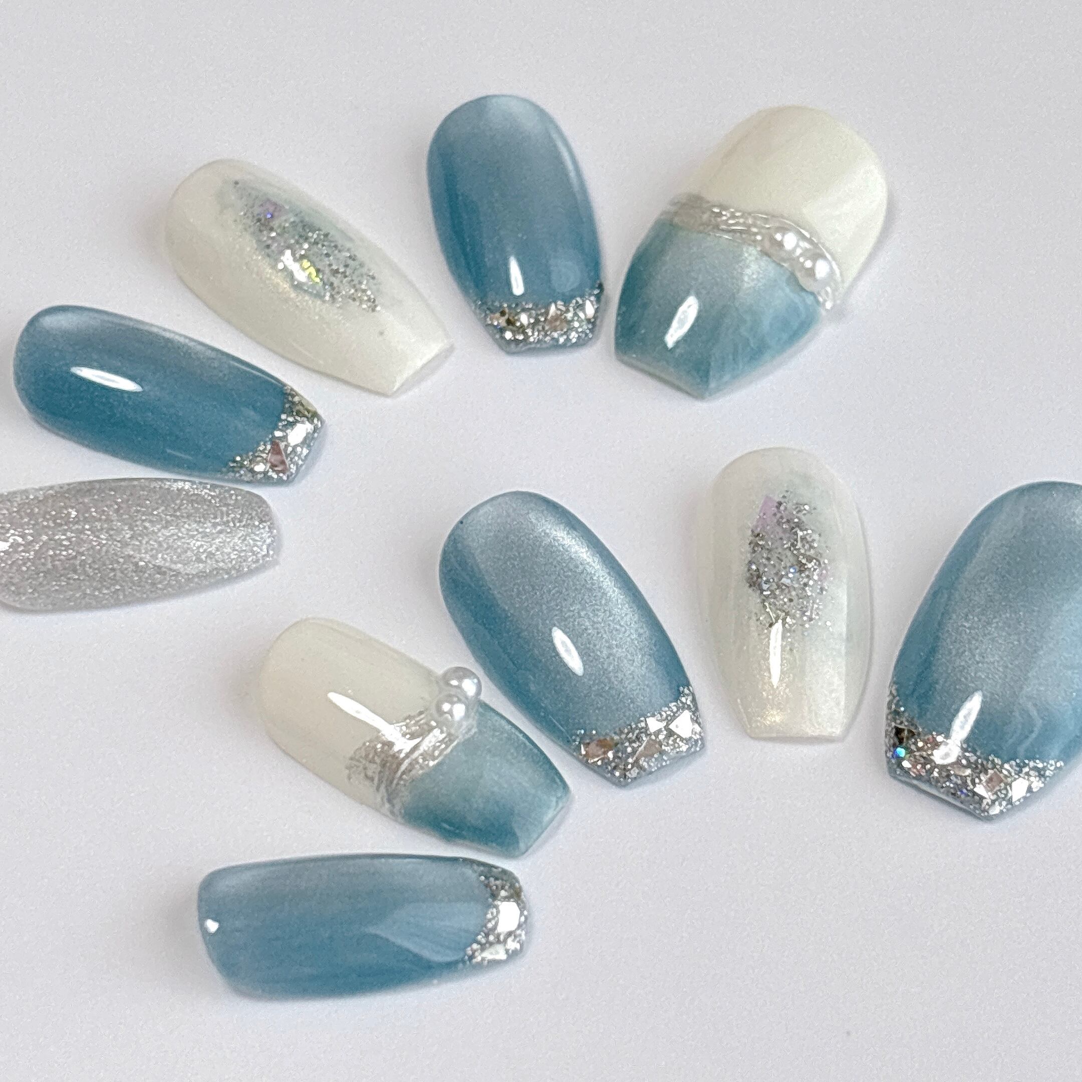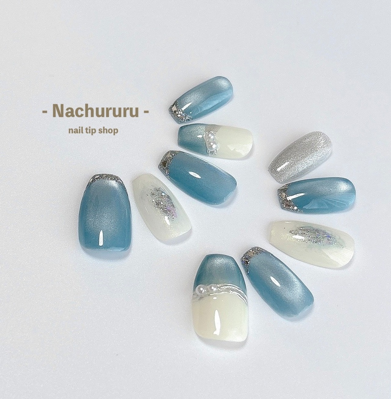 ふんわりと色づくチークネイル風のスカイブルーに、きらめくマグネットの輝きと、繊細なミラーアート&ガラスフレンチを組み合わせた、爽やかで幻想的なネイルチップです。