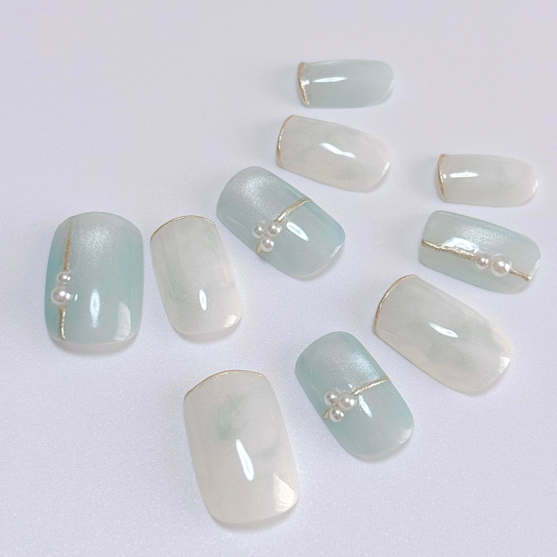 うるツヤ質感の水色うるマグをベースに、柔らかなマーブル模様と繊細に輝くミラーフレンチを組み合わせた大人可愛いニュアンスネイルチップです。