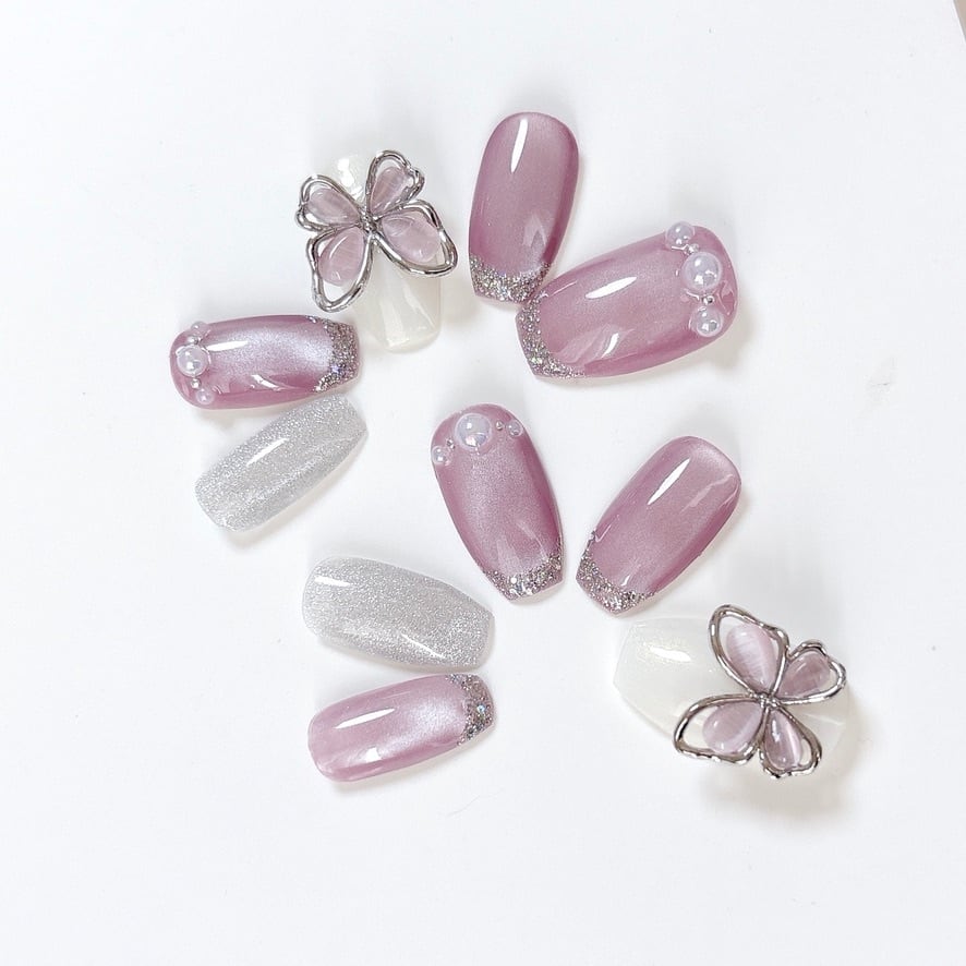 繊細なパープルマグネットの光とガラスフレンチの艶、そして蝶とパールのアクセントを散りばめた「大人可愛いニュアンスネイルチップ」です。