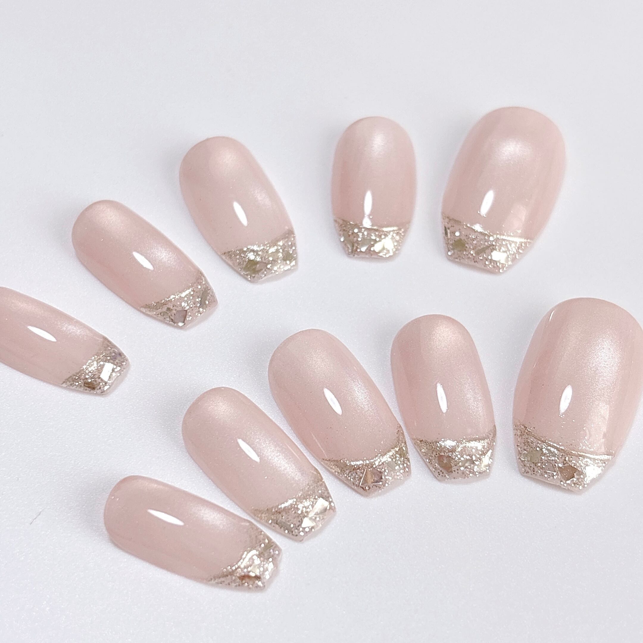 光の角度で上品に輝くマグネットネイルが、まるで指先に春の陽だまりを閉じ込めたような、うるっとした質感と奥行きのある輝きを与えます。