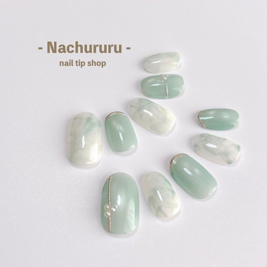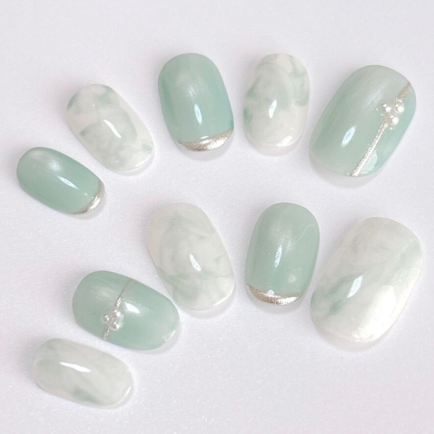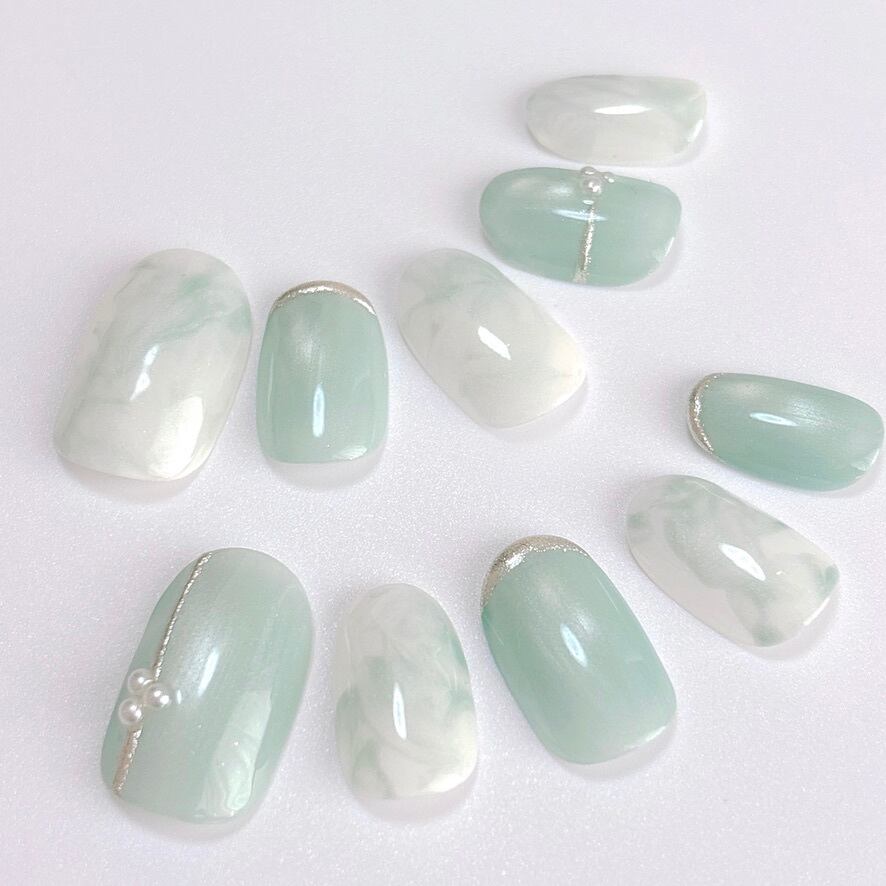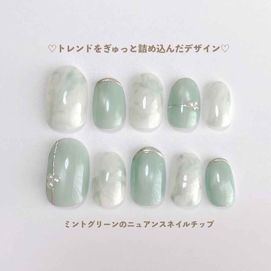 爽やかさ&ときめきを詰め込んだミントグリーンのネイルチップです。一つひとつの指先に違ったニュアンスがあり、見るたびにときめく、儚く美しいネイルデザインです。