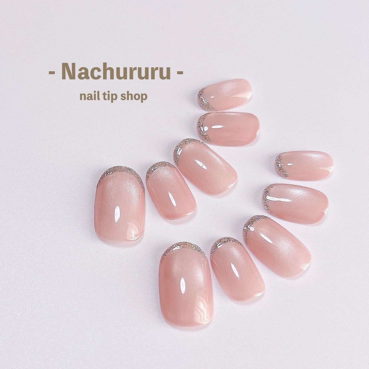 ほんのり透け感のあるペールピンクをベースにした、上品で可愛らしいネイルチップです。先端には繊細なシルバーラメでフレンチラインを施し、さりげない華やかさをプラスしました。