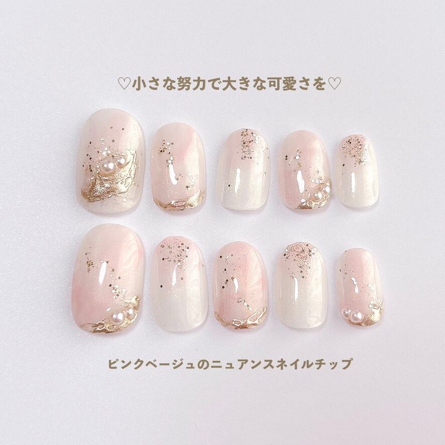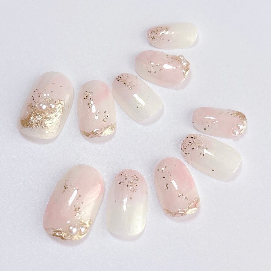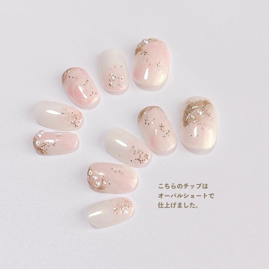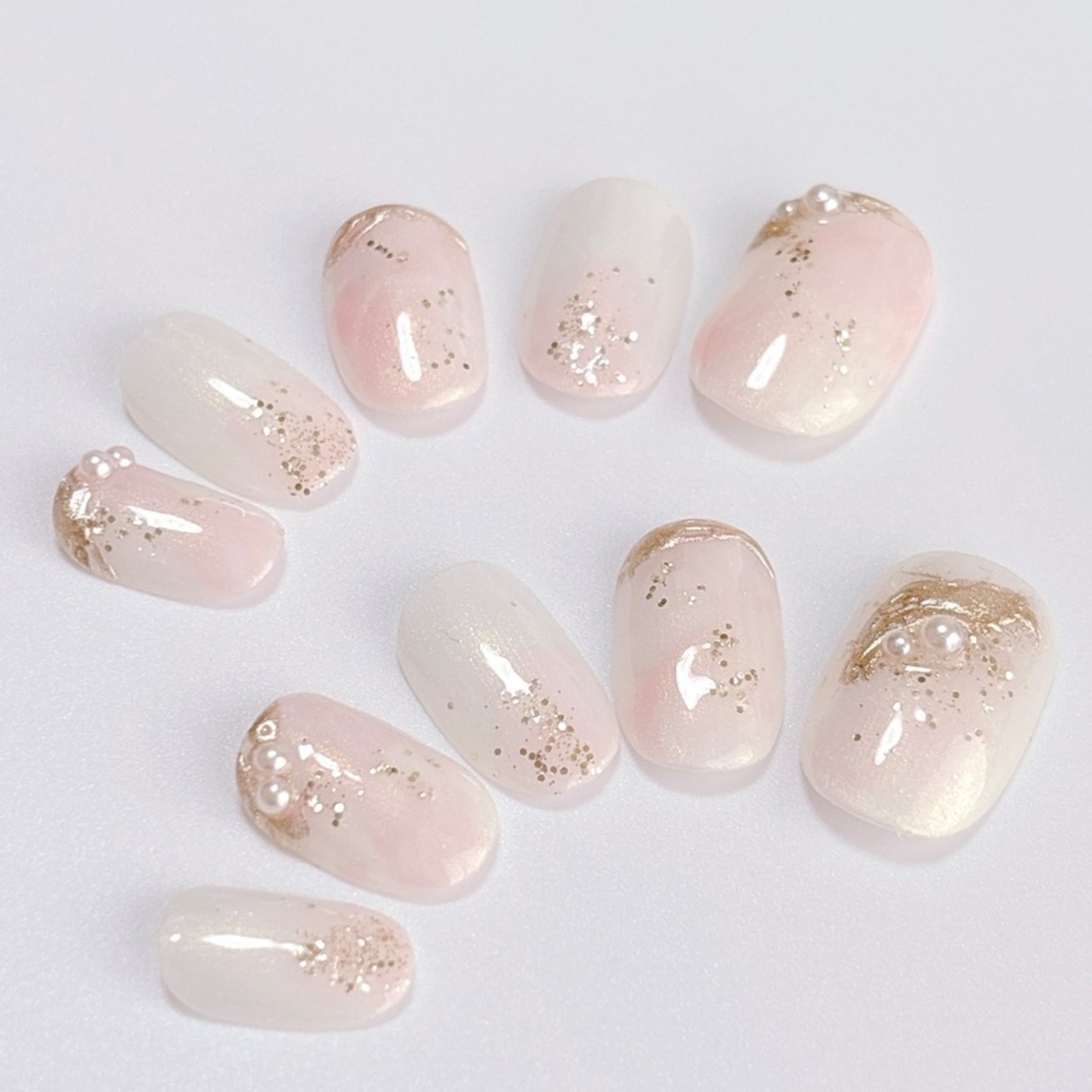 柔らかな乳白色と淡いピンクをベースに、繊細な金箔と煌めくラメをあしらった、上品で華やかなデザインのネイルチップです。