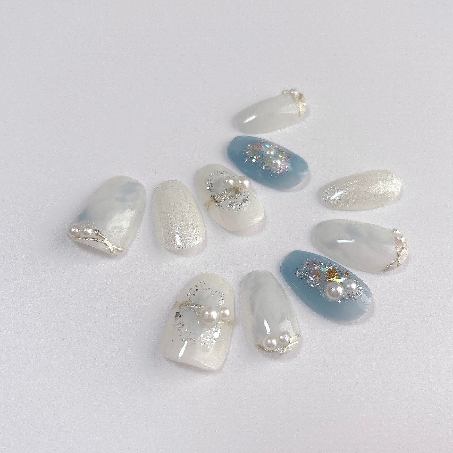 【光を閉じ込めたジュエリーネイル】水色 マーブル ミラーネイル ホログラム ブライダル 女子会 普段使い ニュアンス