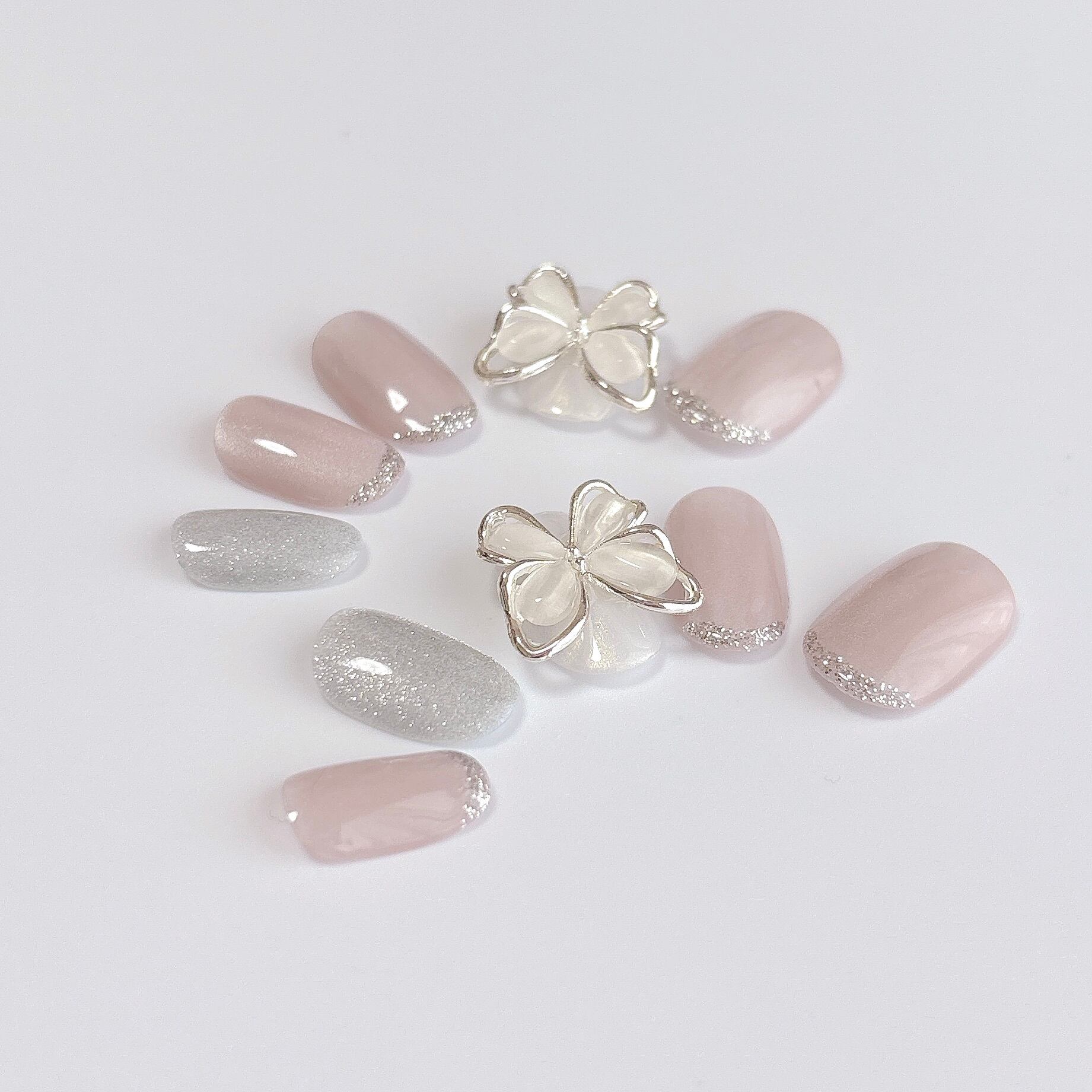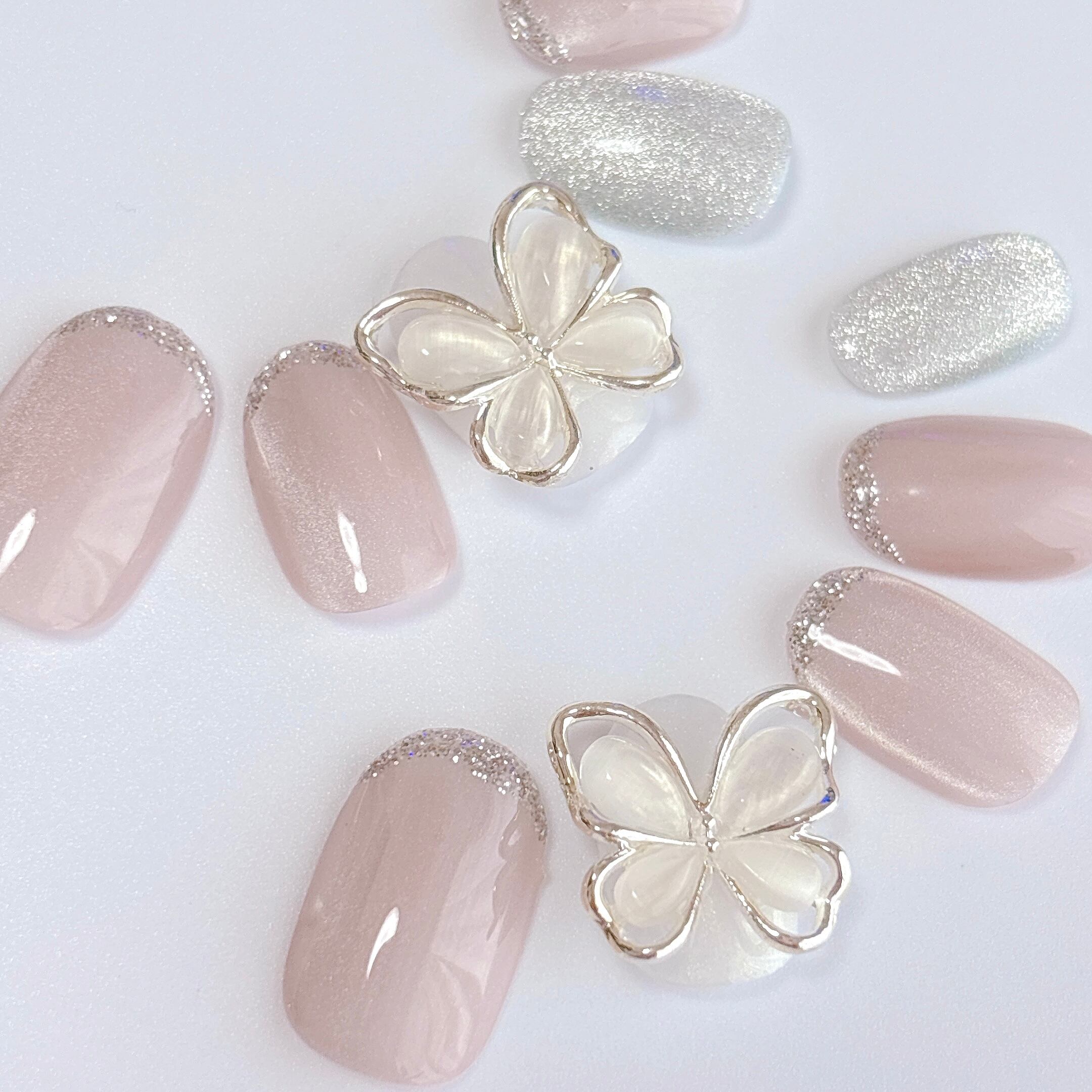 シルクグレージュのマグネットネイルをベースに、上品な輝きを放つシルバーラメでガラスフレンチ風に仕上げました。バタフライパーツが指先に上品な華やかさをプラスします。