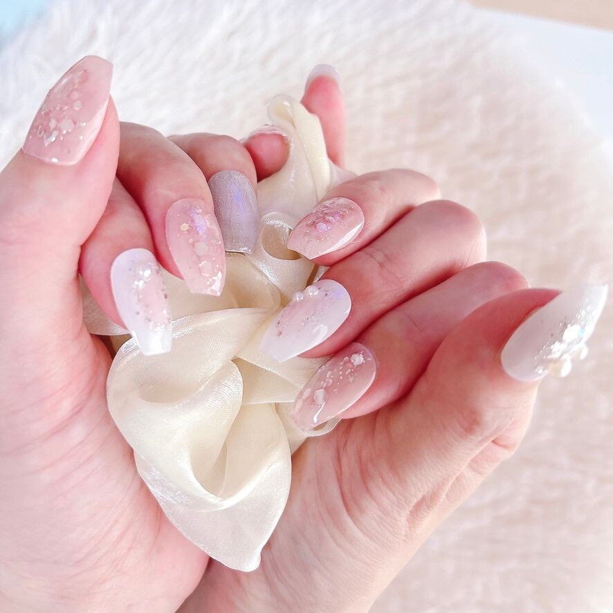 クリア感のある桜色に、角度によって輝くマグネットを重ねて幻想的な光を演出。ホワイトパールとホログラムをあしらい、可愛らしさとエレガントさを両立しました。