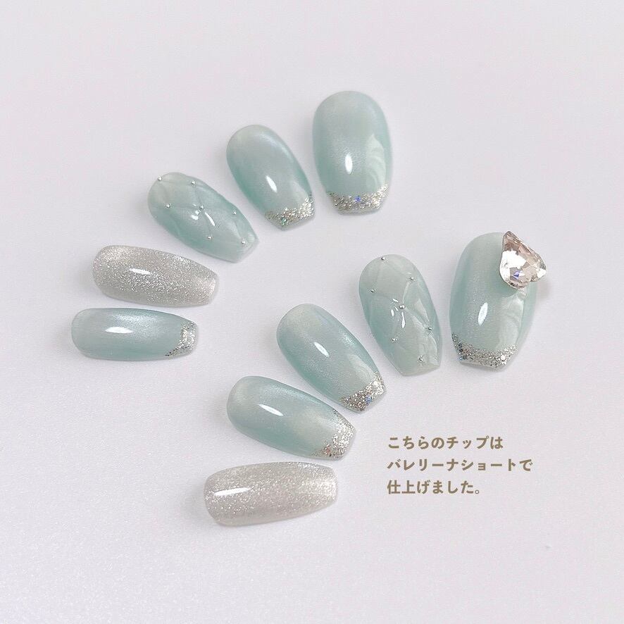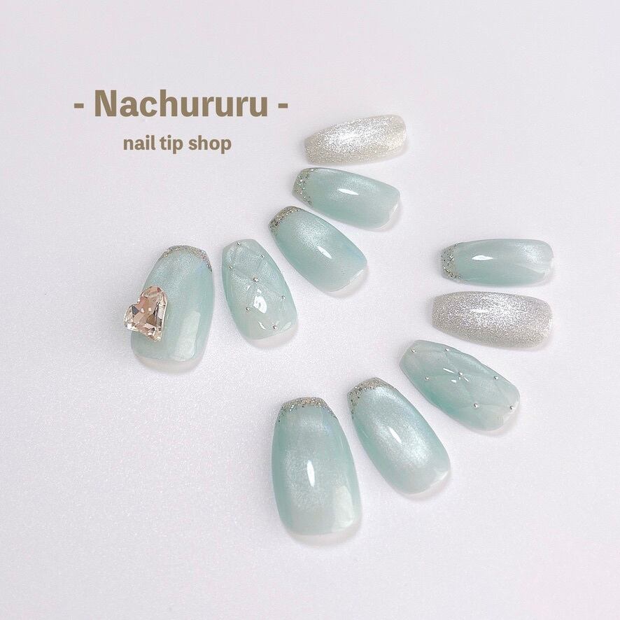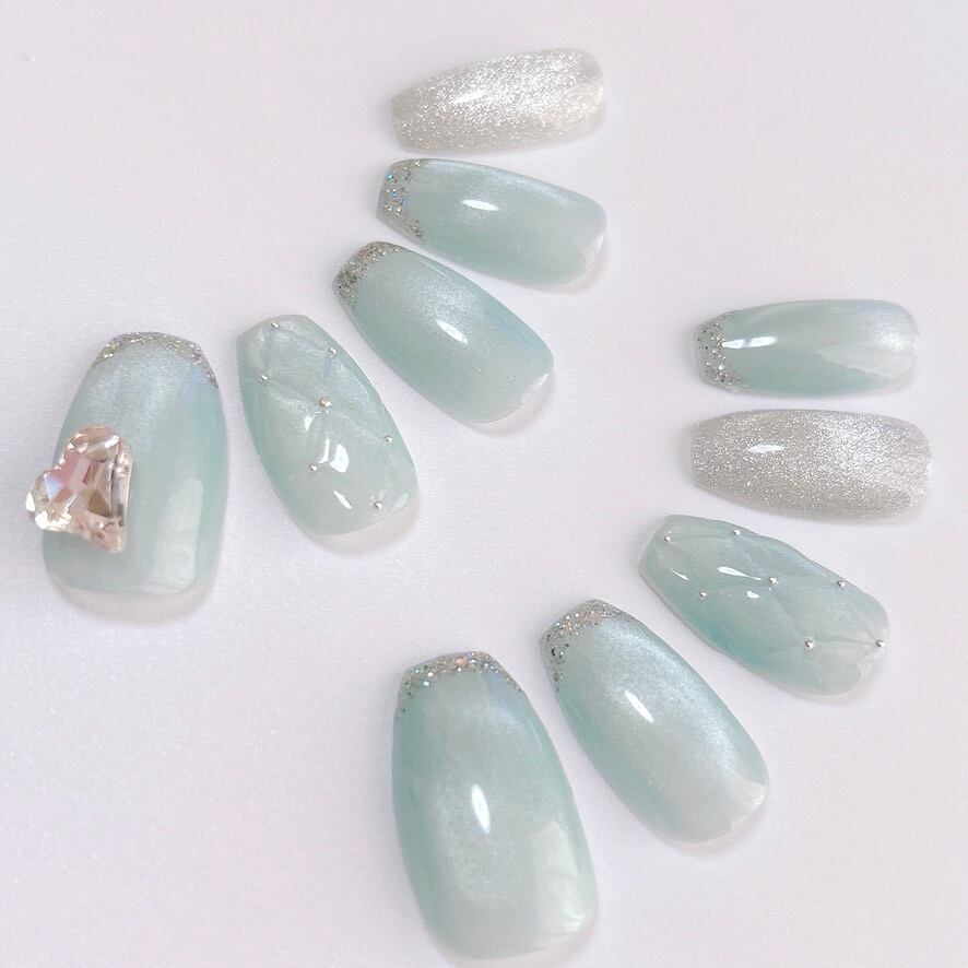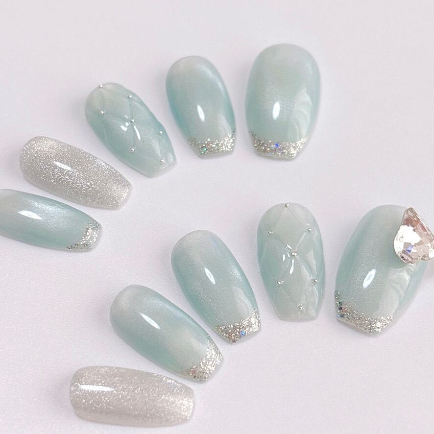 透明感あり水色のうるマグをベースに、立体感のあるキルティングと光を集めるガラスフレンチを合わせた上品なネイルチップです。