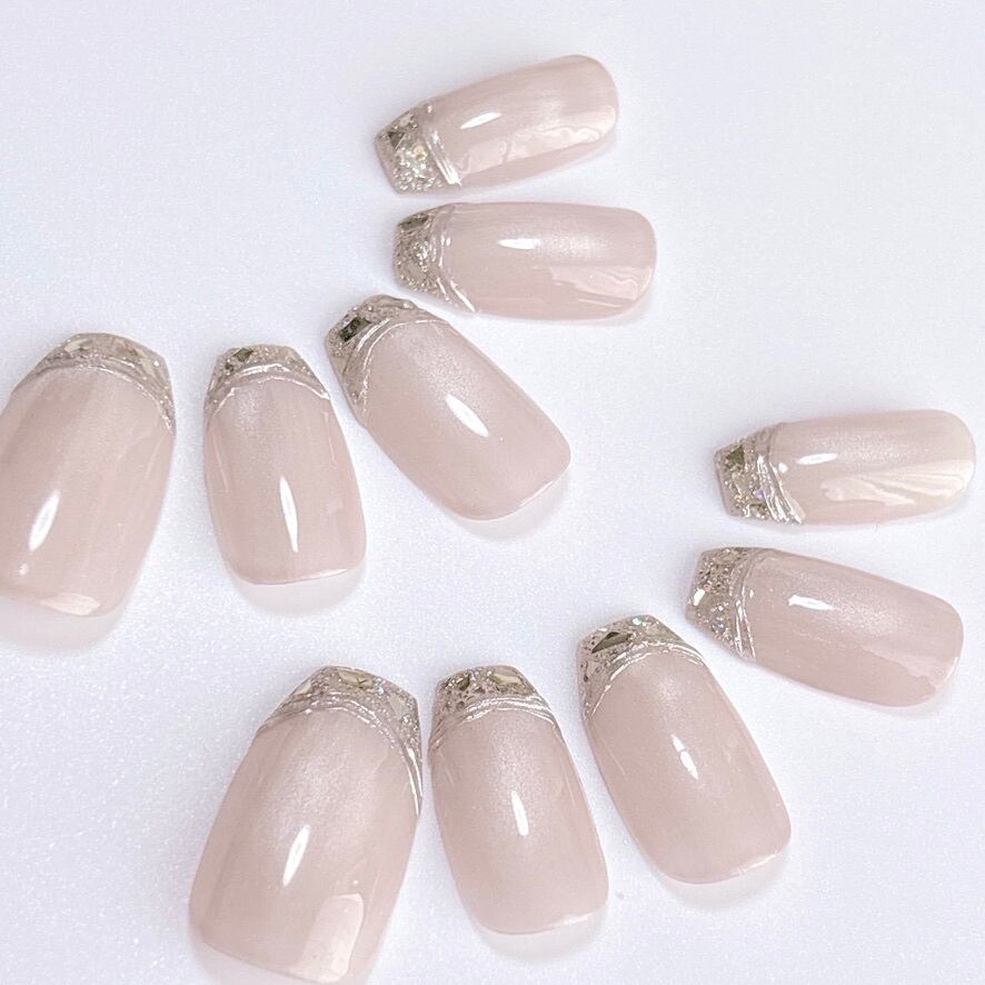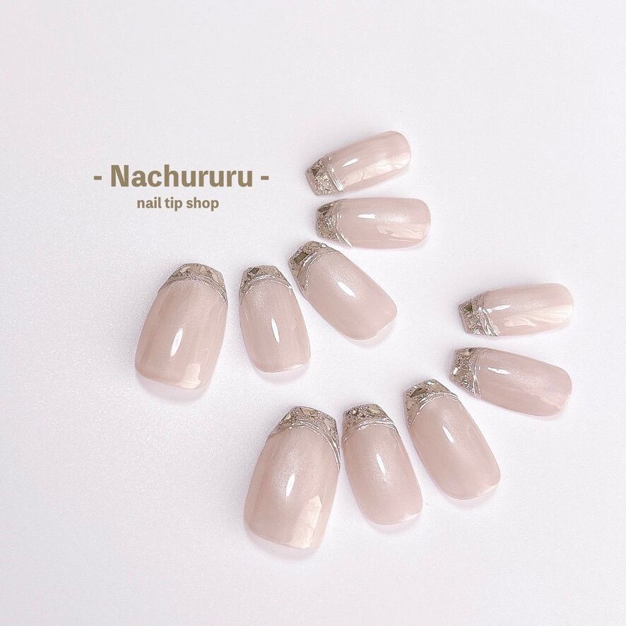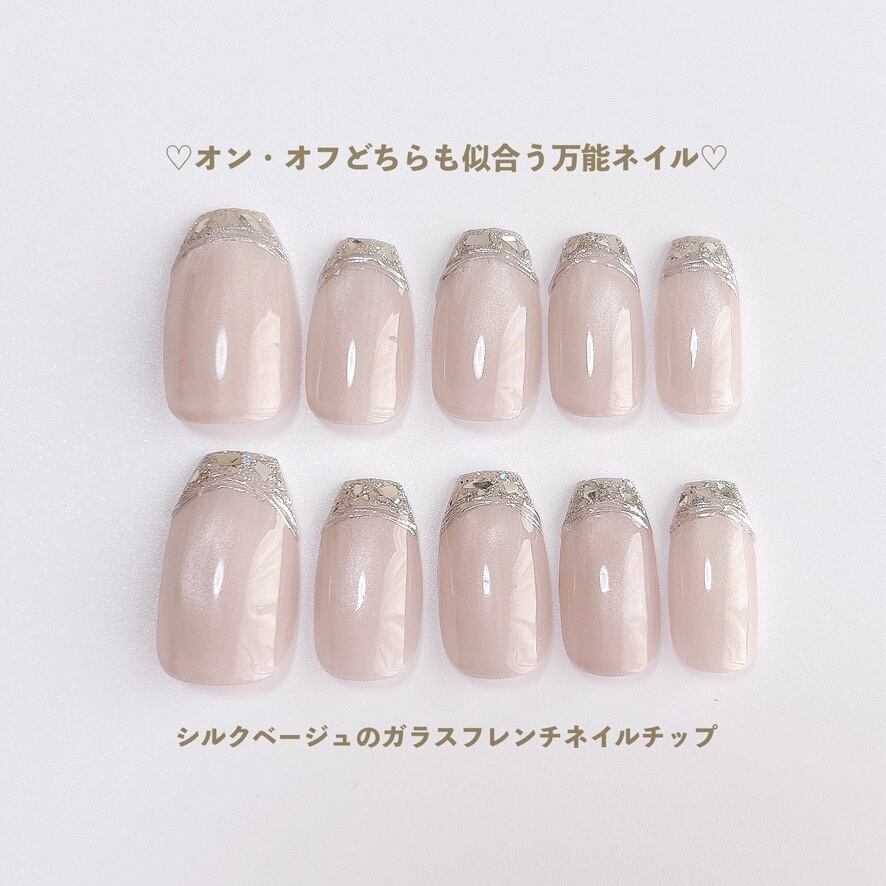 【049現品販売】シルクベージュ マグネットネイル ガラスフレンチ シンプル ネイルチップ オフィス 淡色 デート