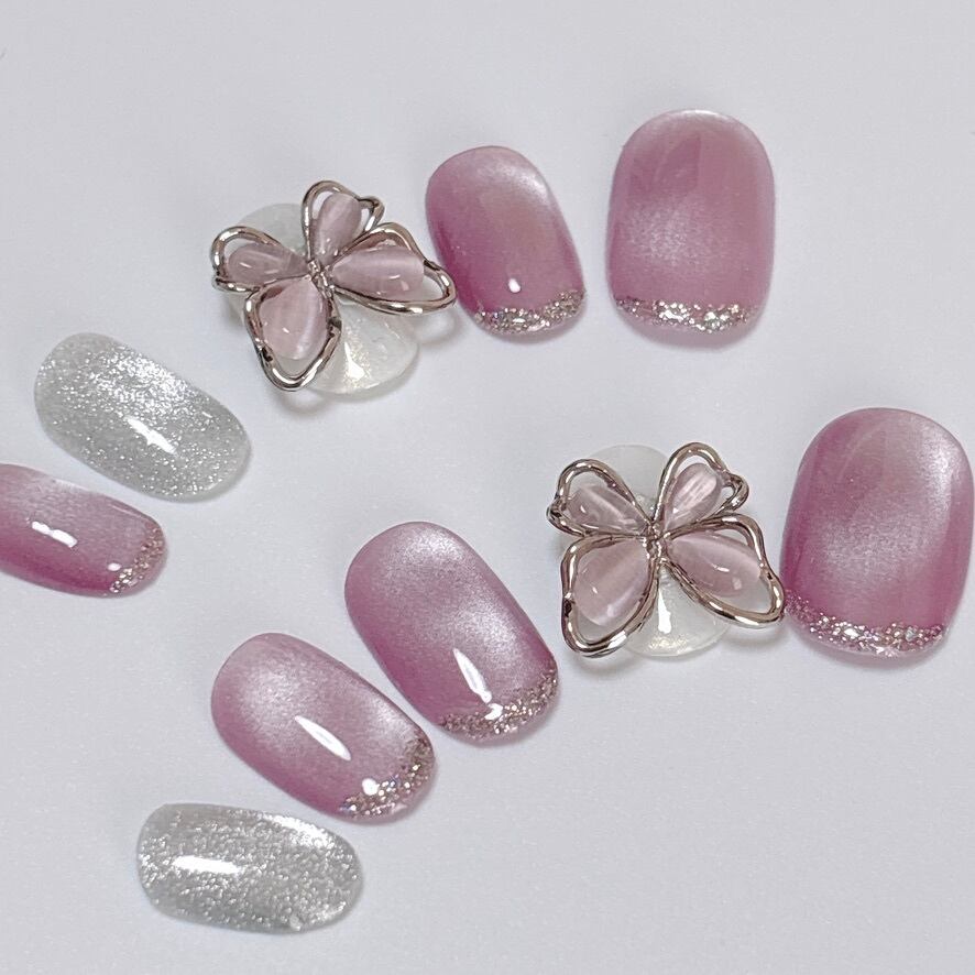 繊細なパープルマグネットの光とガラスフレンチの艶、蝶がアクセントとなった大人可愛いニュアンスネイルチップです。
