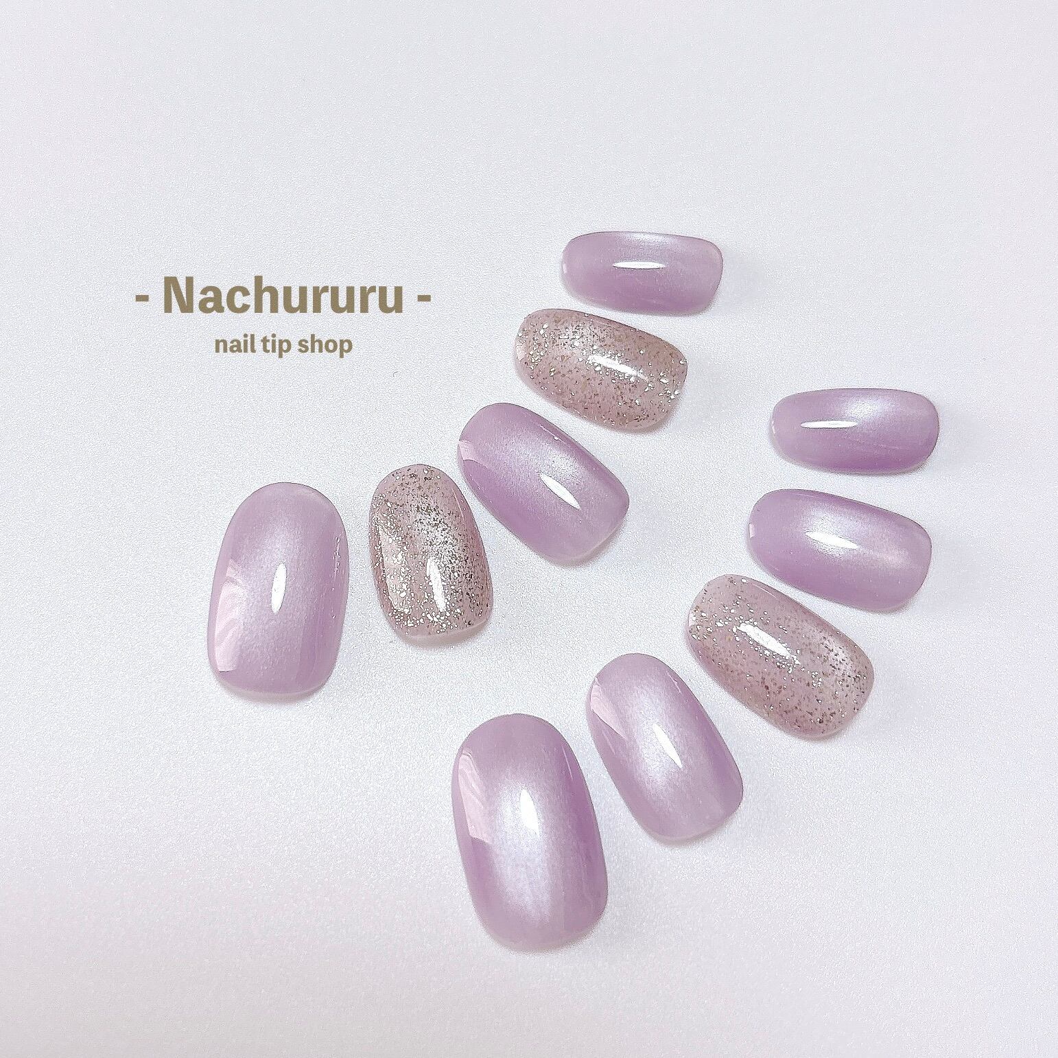 シルクのようなラベンダーカラーをメインにしたネイルチップで、光の当たり方によって表情を変え、指先に透明感と上品なツヤを与えます。