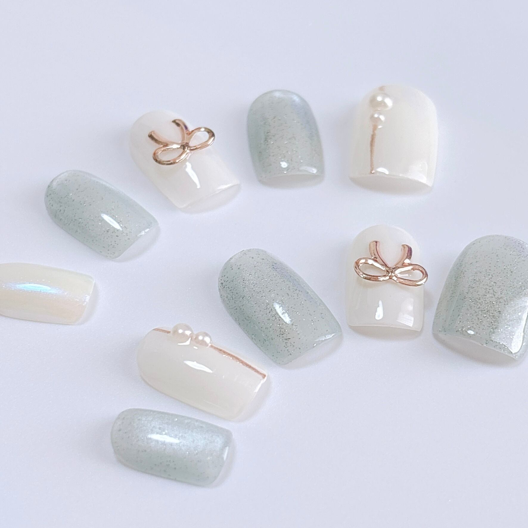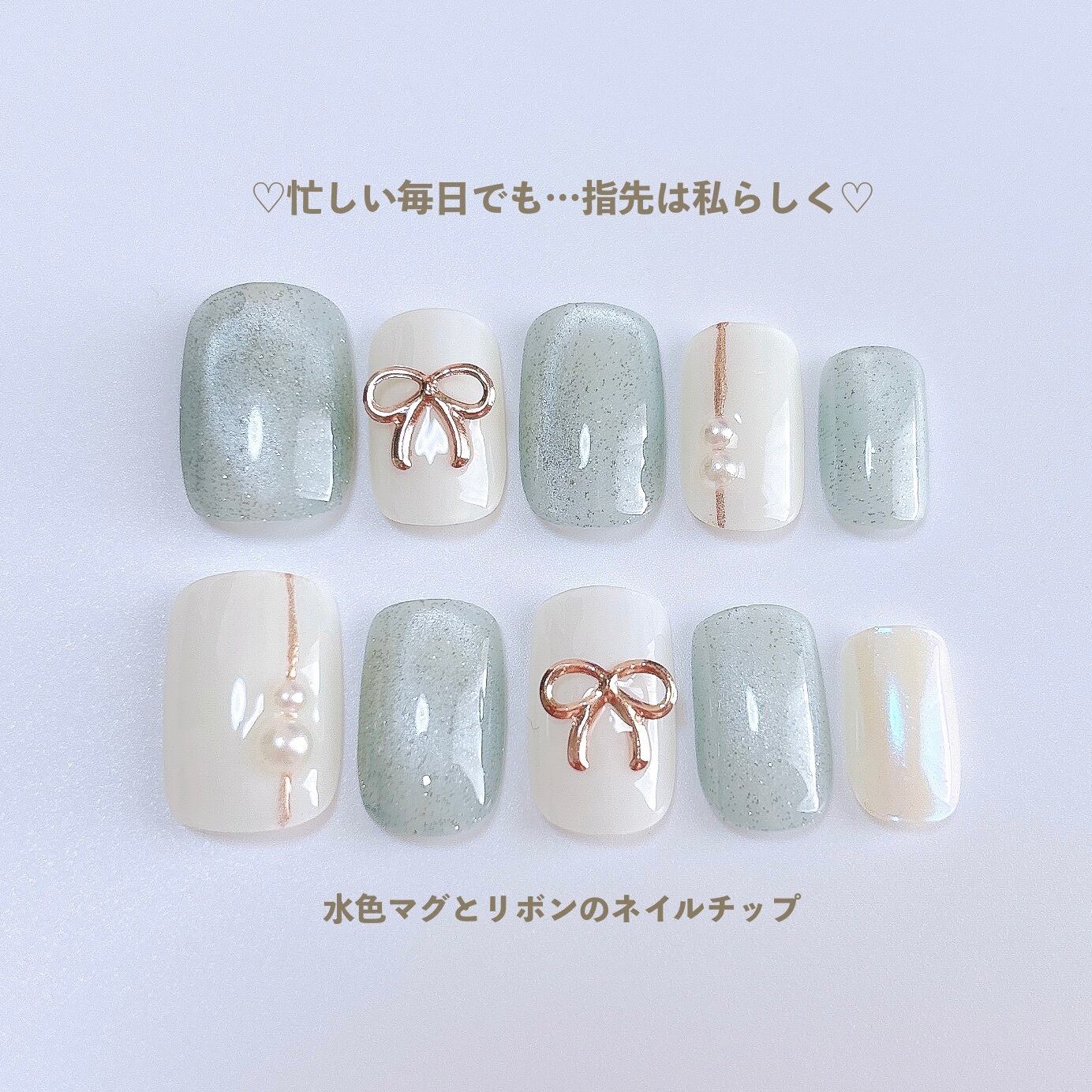 【清楚に輝くうるツヤ感】水色 マグネット リボン ミラーアート パール ネイルチップ デート 大人可愛い