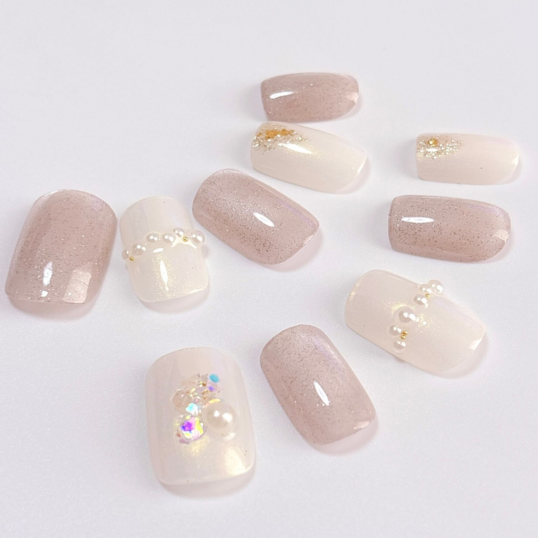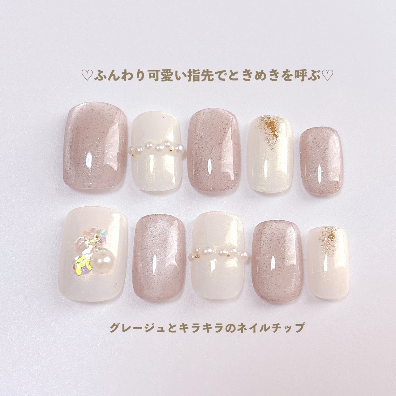 【甘すぎない大人のモテネイル】シルクグレージュ マグネット パール ホログラム ネイルチップ 秋 大人可愛い フォーマル