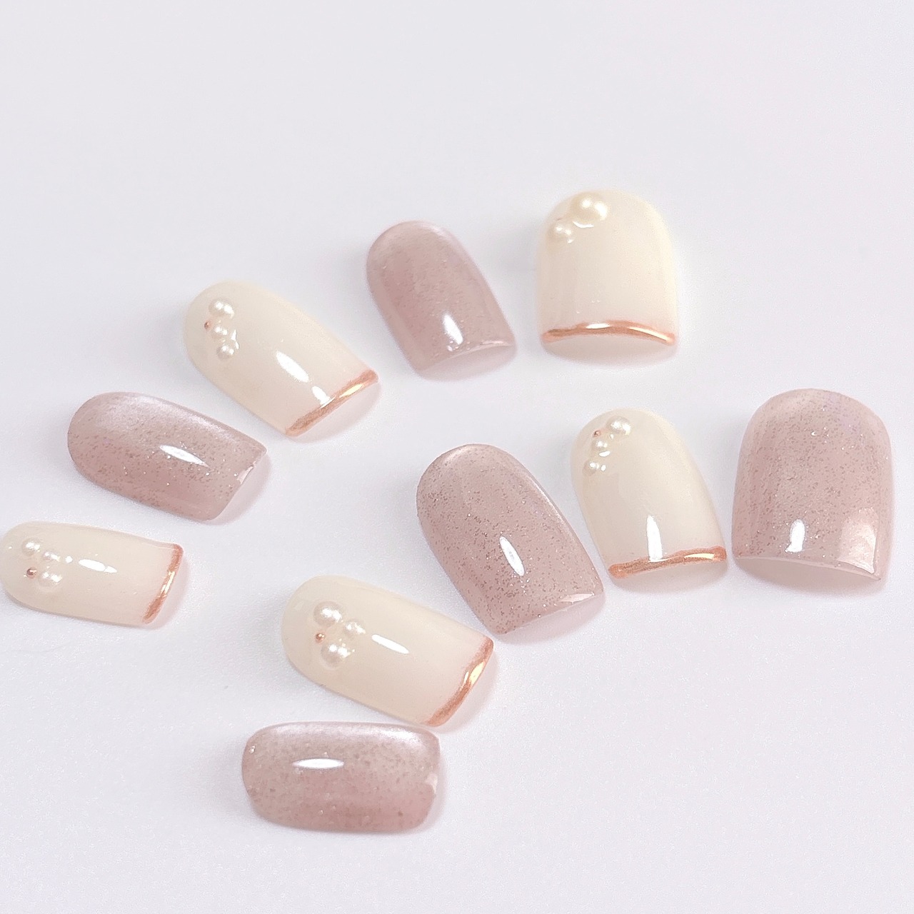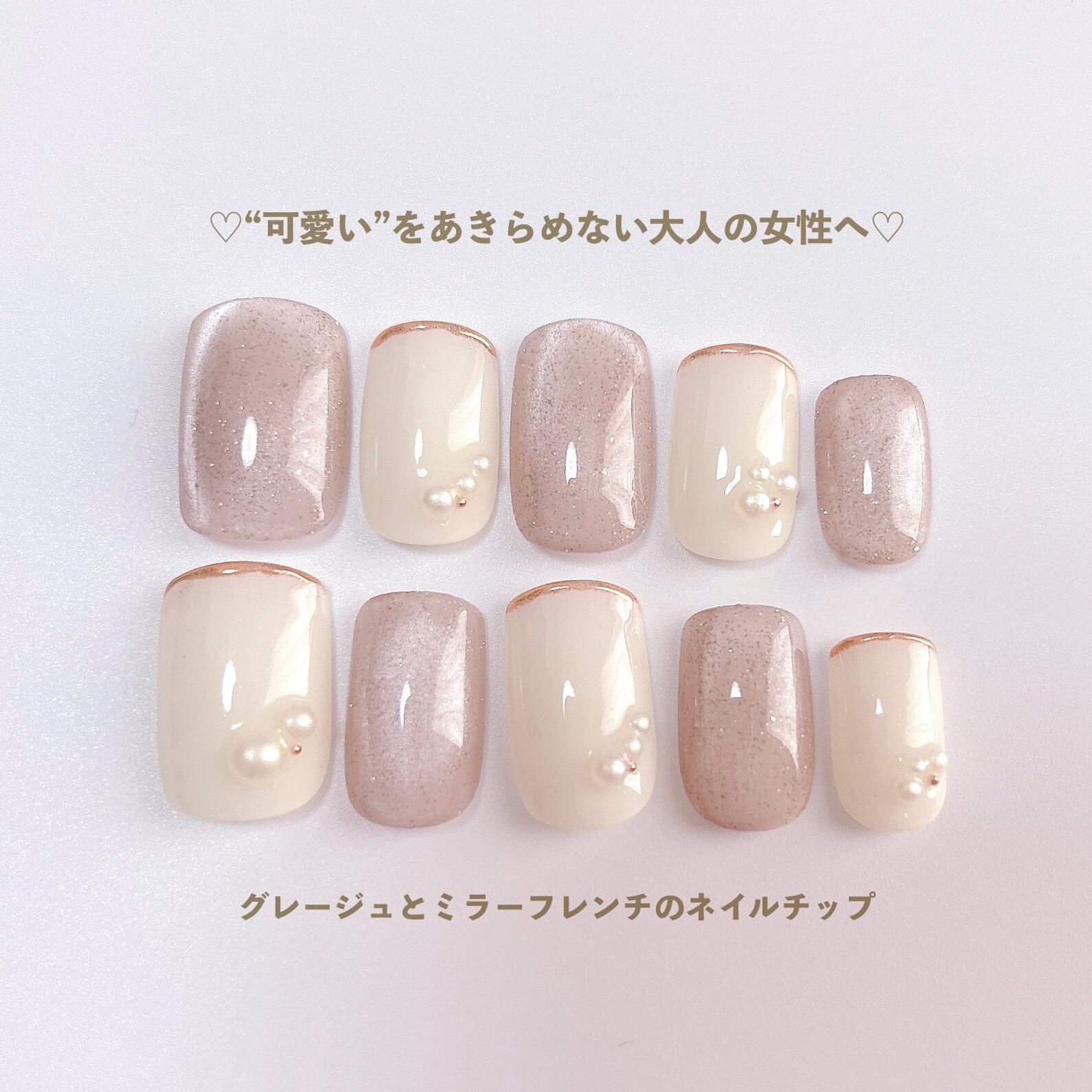 【気取らず可愛い上品ネイル】シルクグレージュ マグネット パール ミラーフレンチ ネイルチップ 秋 春