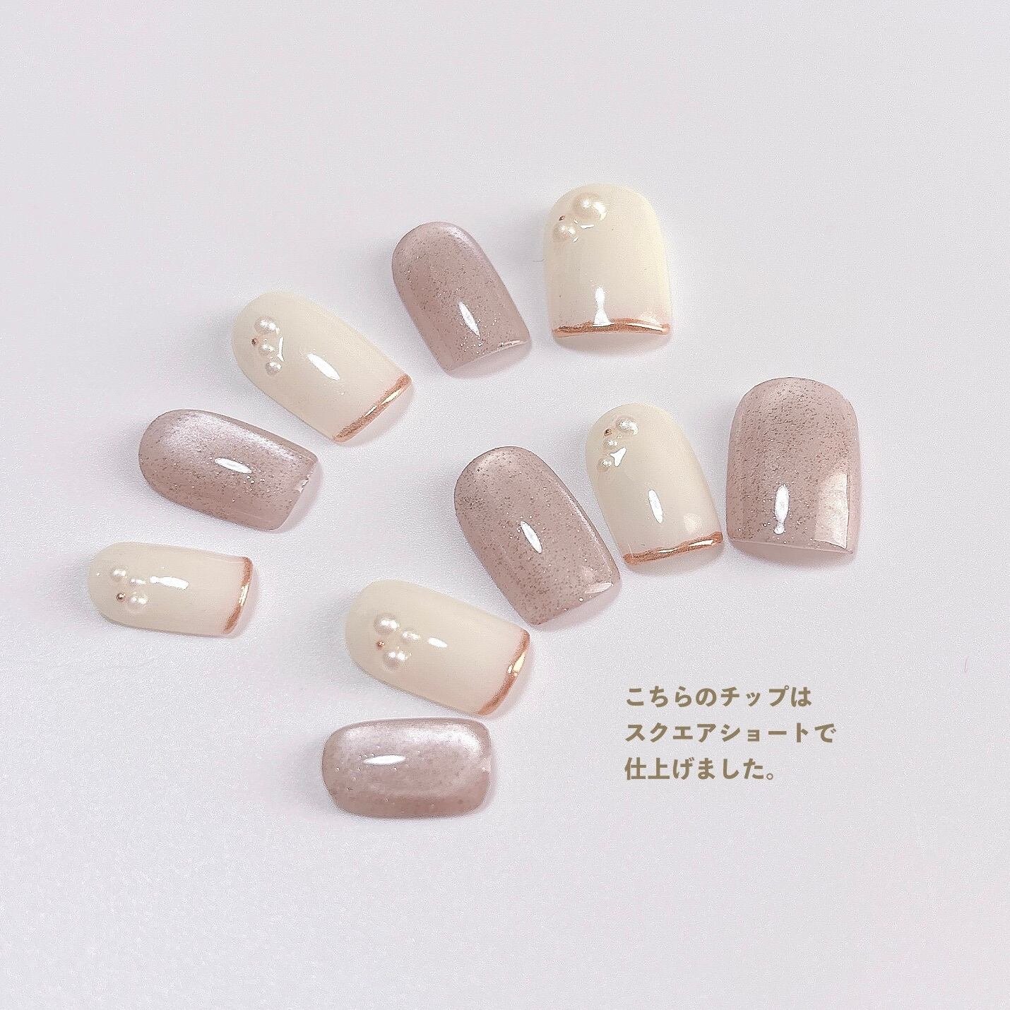 繊細なラメが上品な光沢を放つシルクグレージュのマグネットジェルと柔らかなアイボリージェルのネイルチップです。