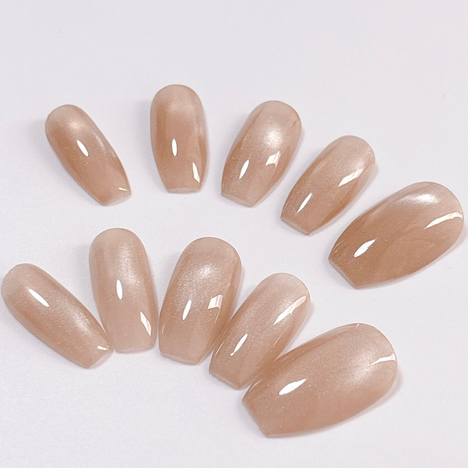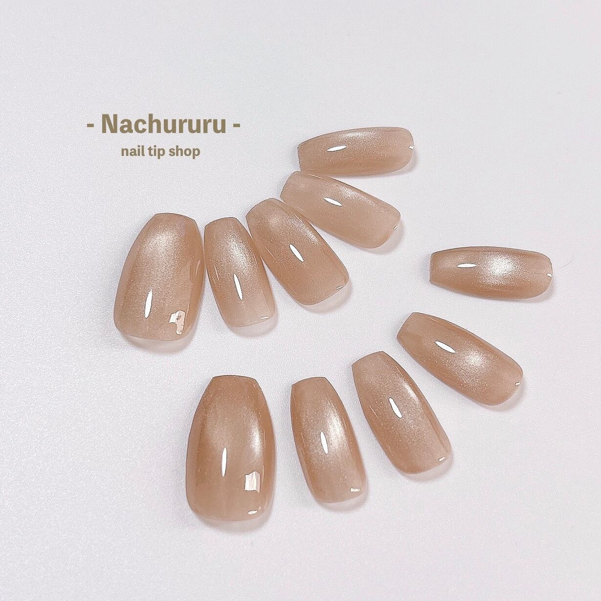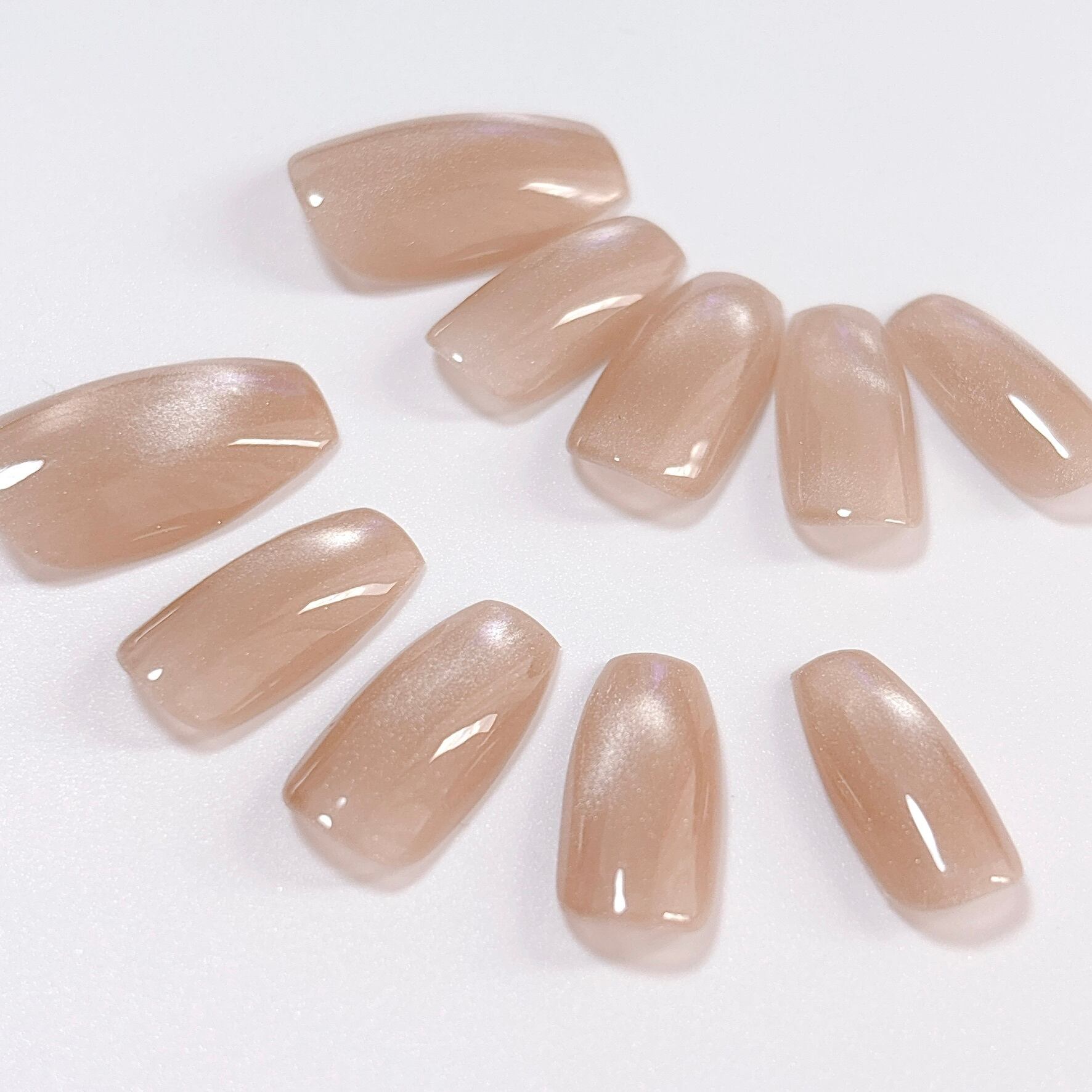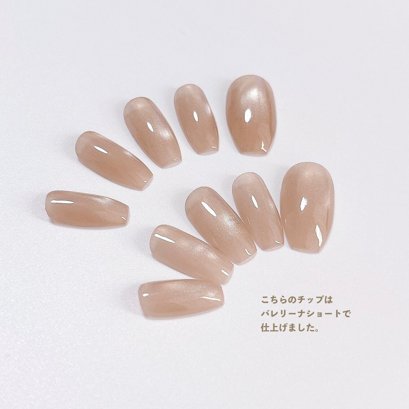 肌馴染みが良く、指先をきれいに見せてくれるゴールドベージュのワンカラーネイルチップです。繊細なマグネットの輝きが、角度によって様々な表情を見せ、奥行きのある上品な光沢を演出します。