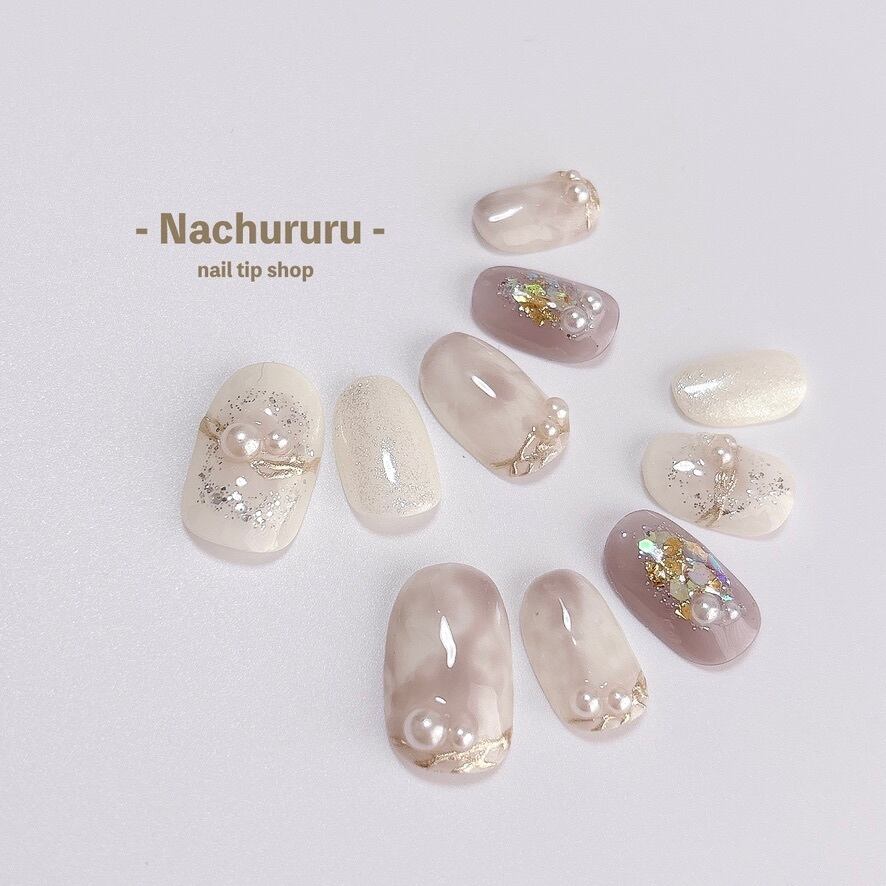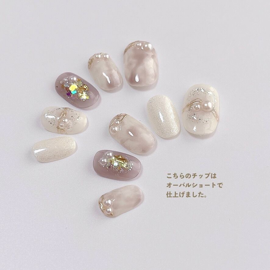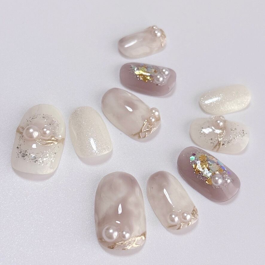 柔らかなホワイトとグレージュのマーブル模様をベースに、繊細なラメと艶やかなパールをあしらいました。