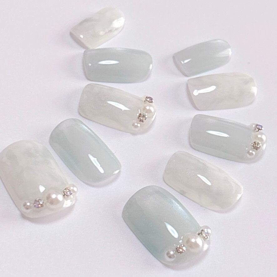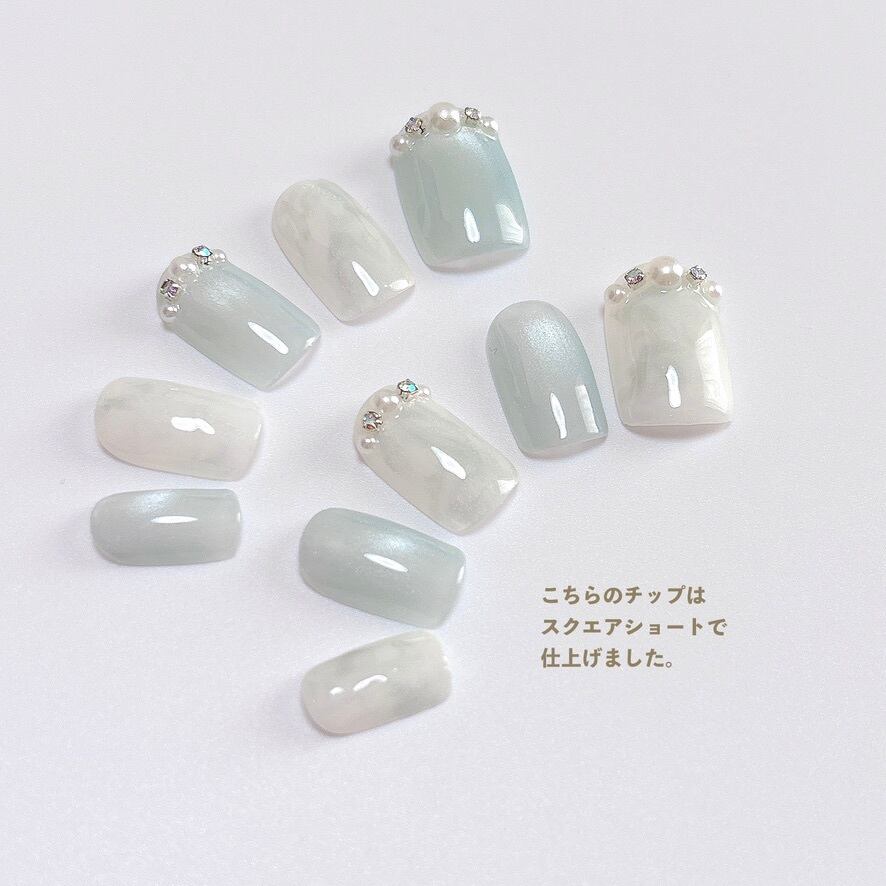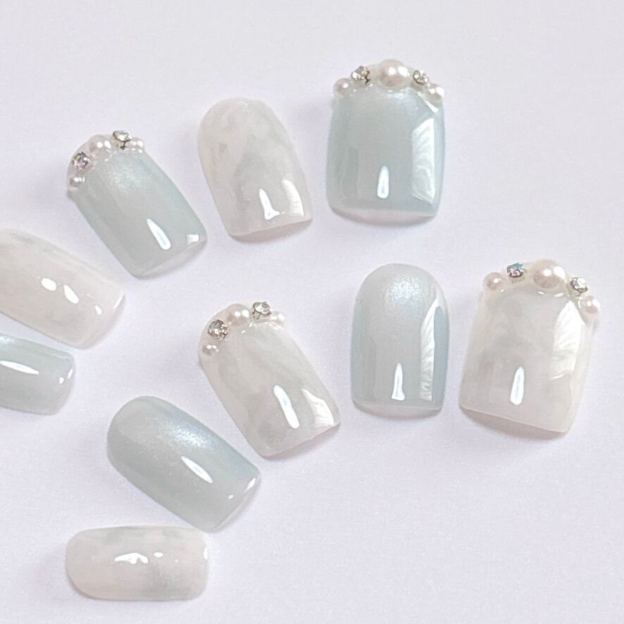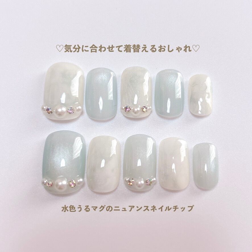 うるうる水色のマグネットネイルとホワイトの組み合わせが美しい、涼しげなデザインのネイルチップです。さりげないパールとビジューが上品な輝きをプラスして指先を華やかに演出してくれます。