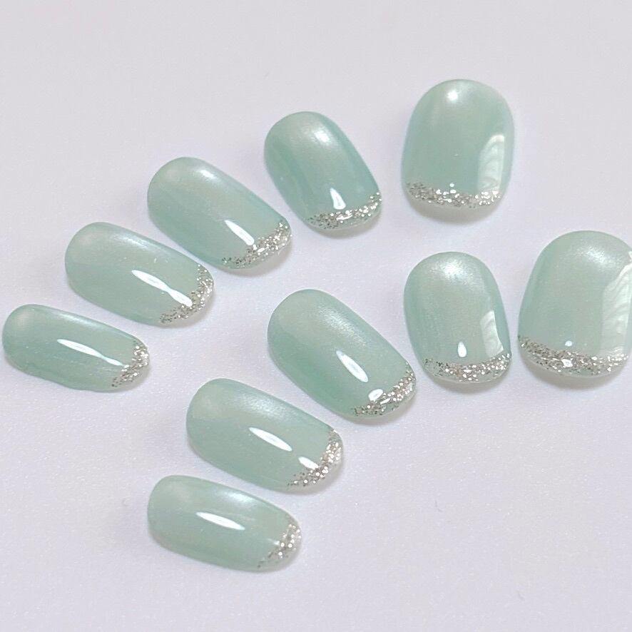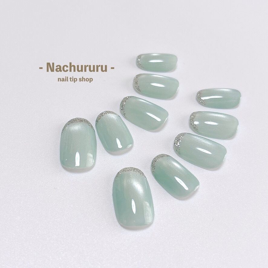ミントグリーンのマグネットネイルのうる艶とガラスフレンチの繊細な透明感を合わせたネイルチップです。