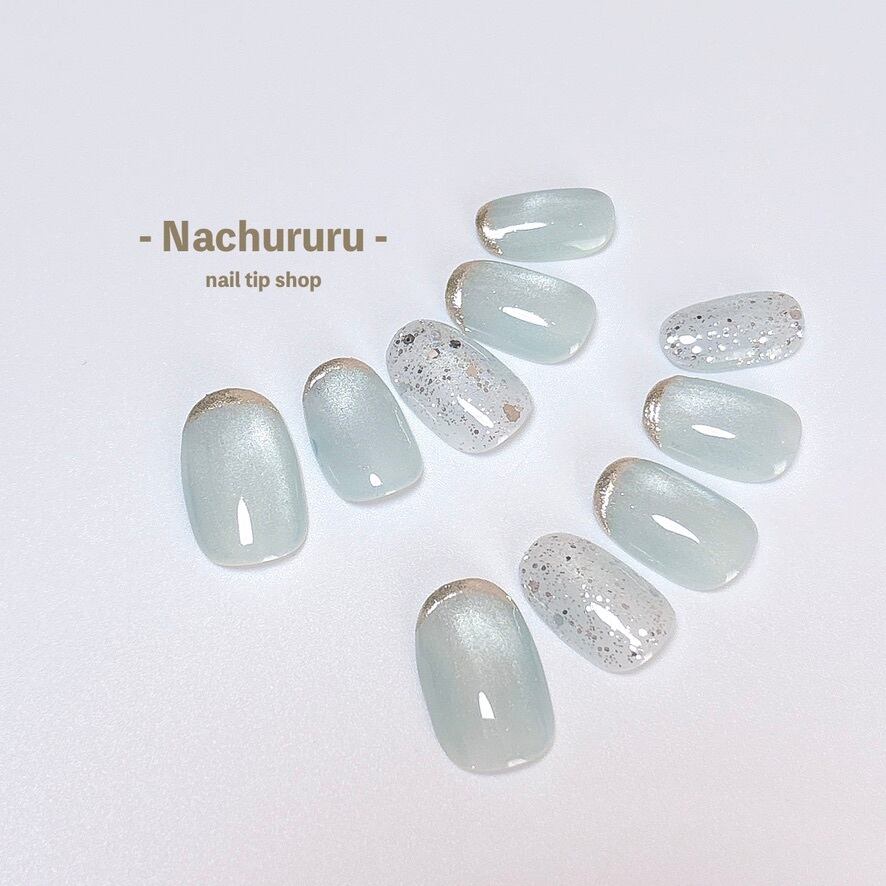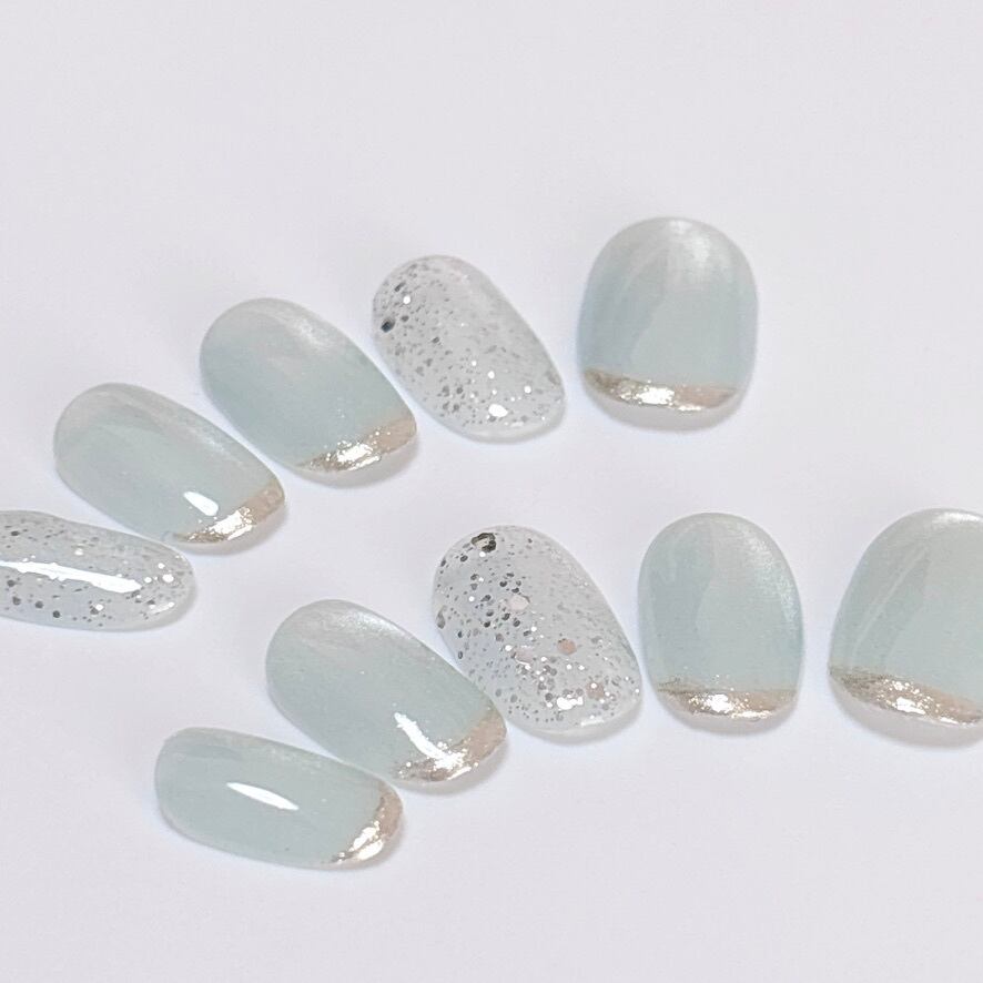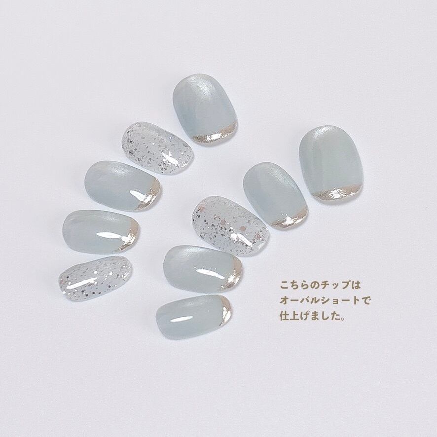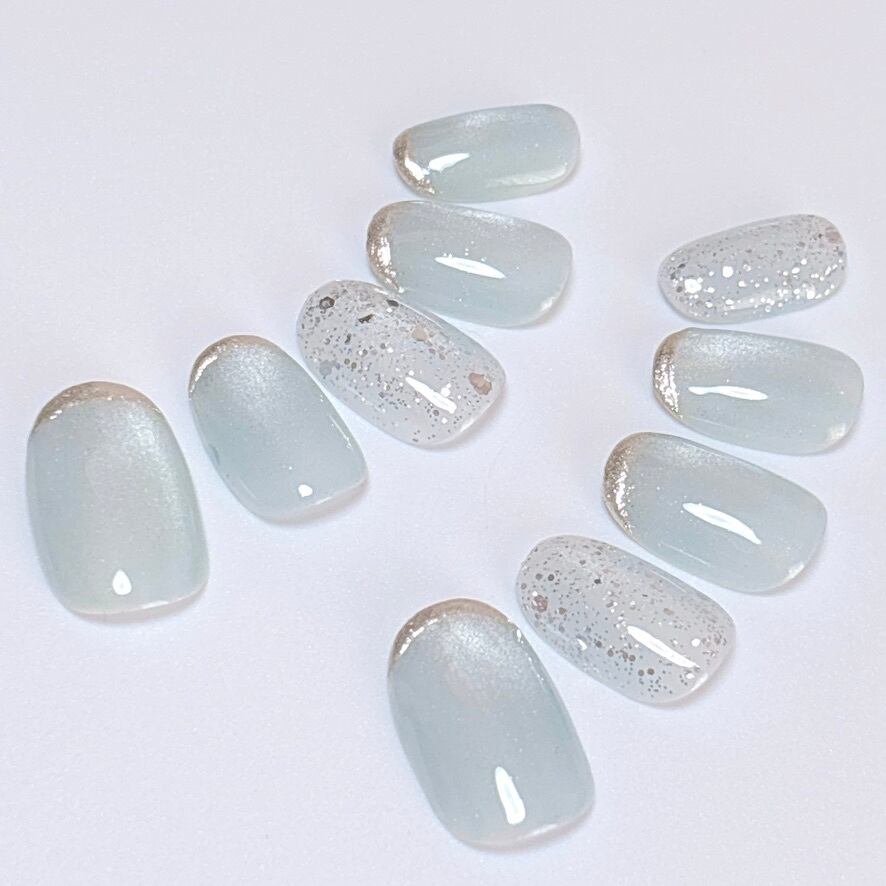 【085 現品販売】水色マグネット うるマグ ミラーフレンチ シルバーラメ ネイルチップ ちゅるん シンプル 上品 淡色