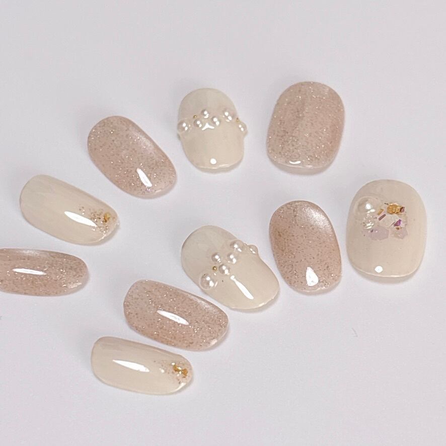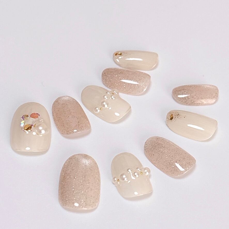 【089 現品販売】ゴールドベージュ マグネット ゴールドラメ ホログラム パール ネイルチップ オフィス