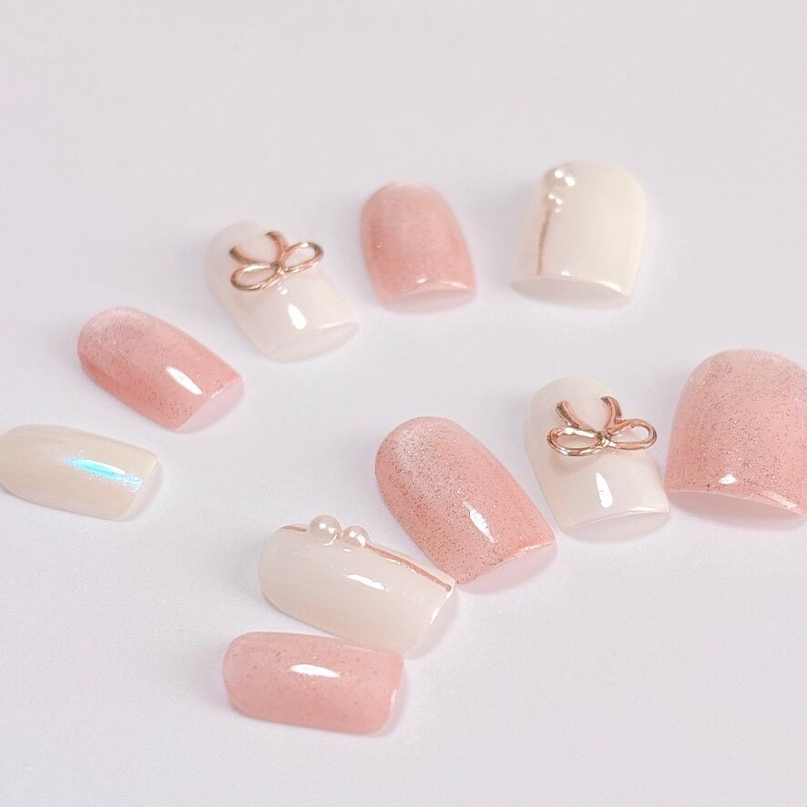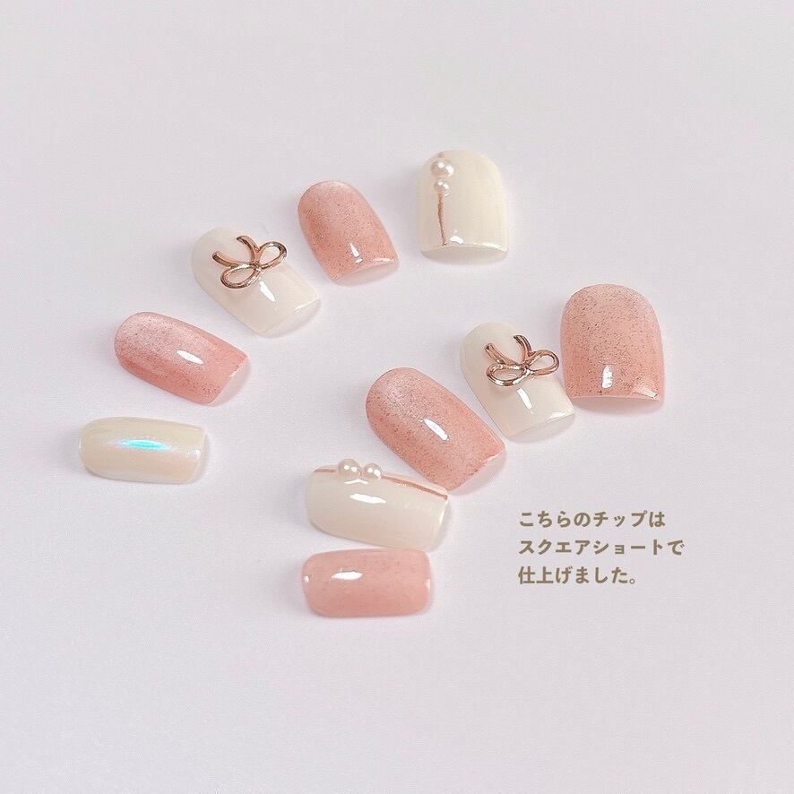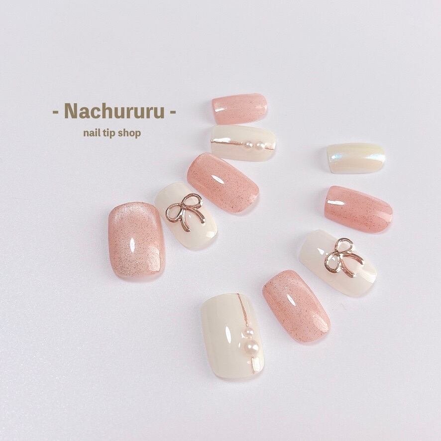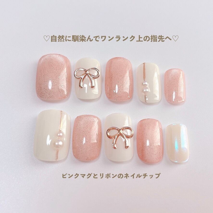 【095 現品販売】ヌーディピンク マグネット リボン ミラーアート パール ネイルチップ デート 春ネイル