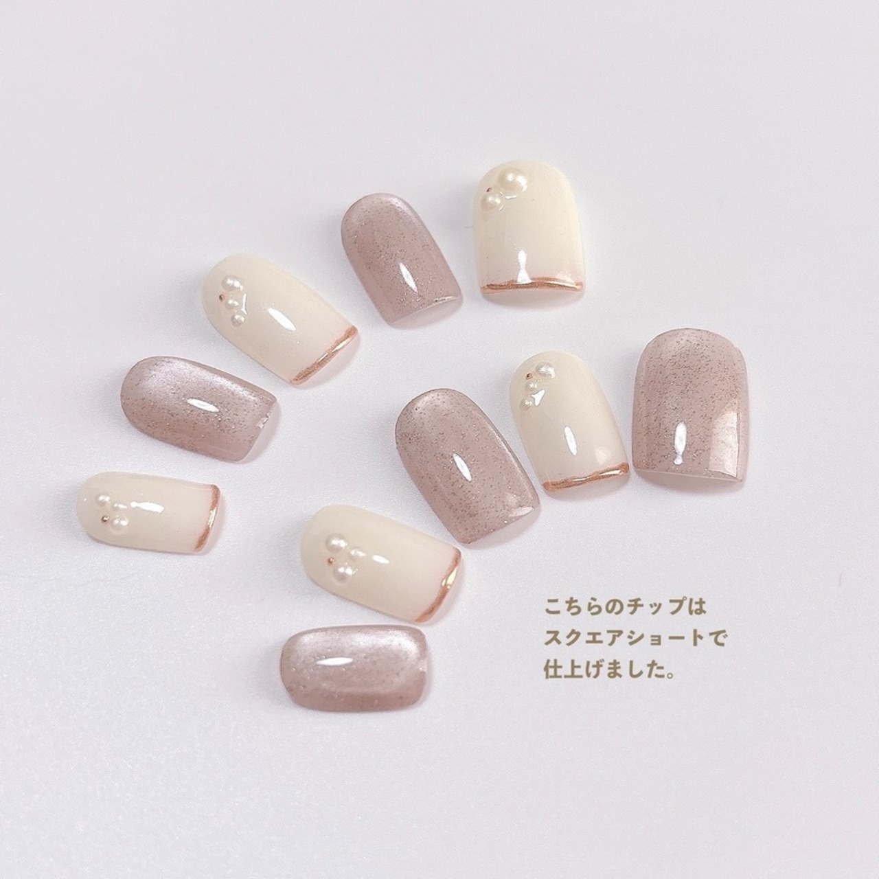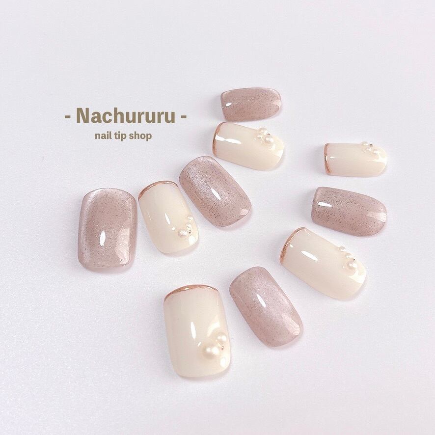 【107 現品販売】シルクグレージュ マグネット パール ミラーフレンチ ネイルチップ 秋ネイル フォーマル